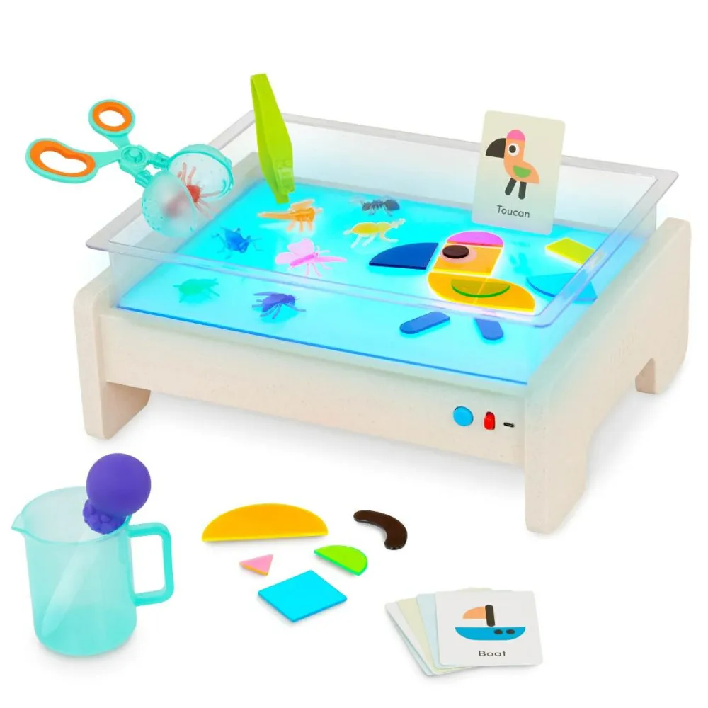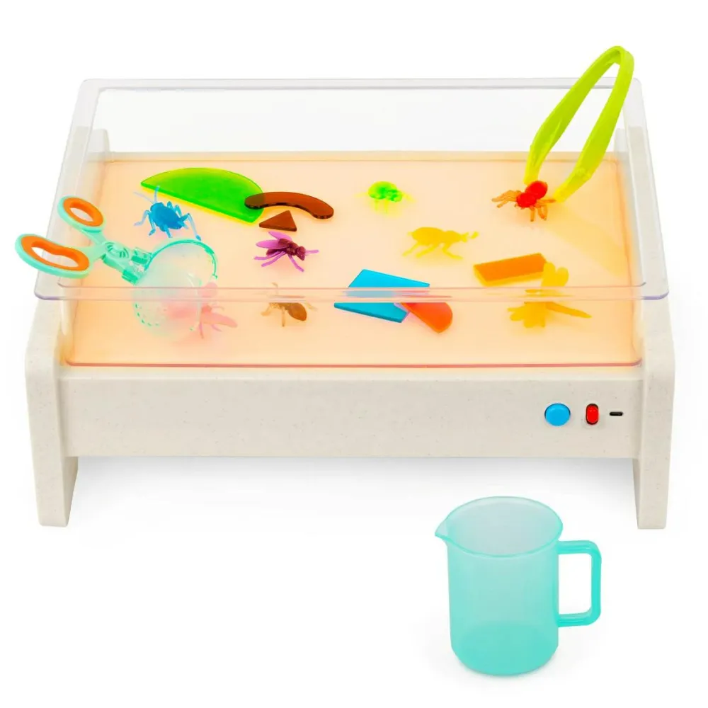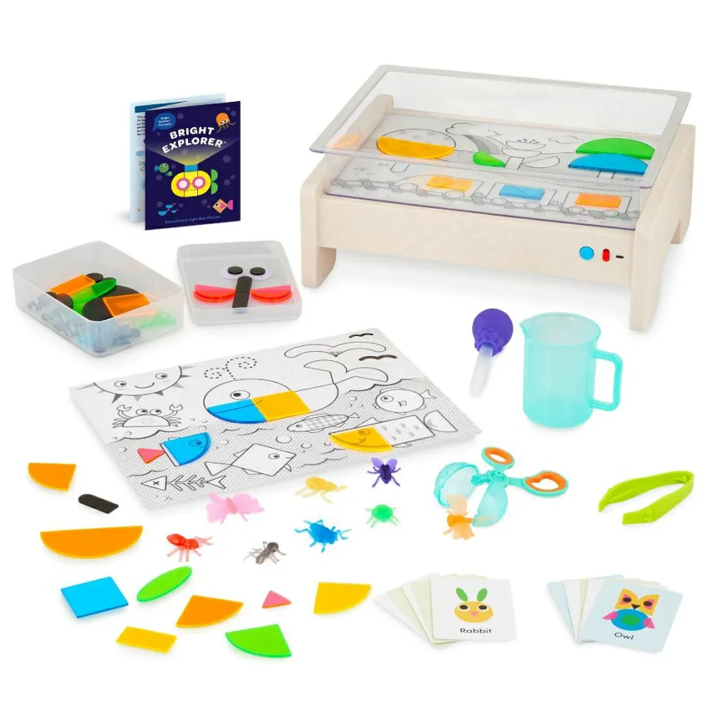 Alsidigt og interaktivt lysbord med masser af tilbehør, som lader dit barn lære og lege med lys og farver.