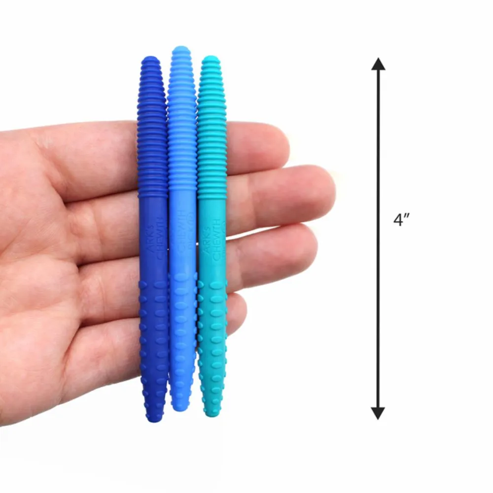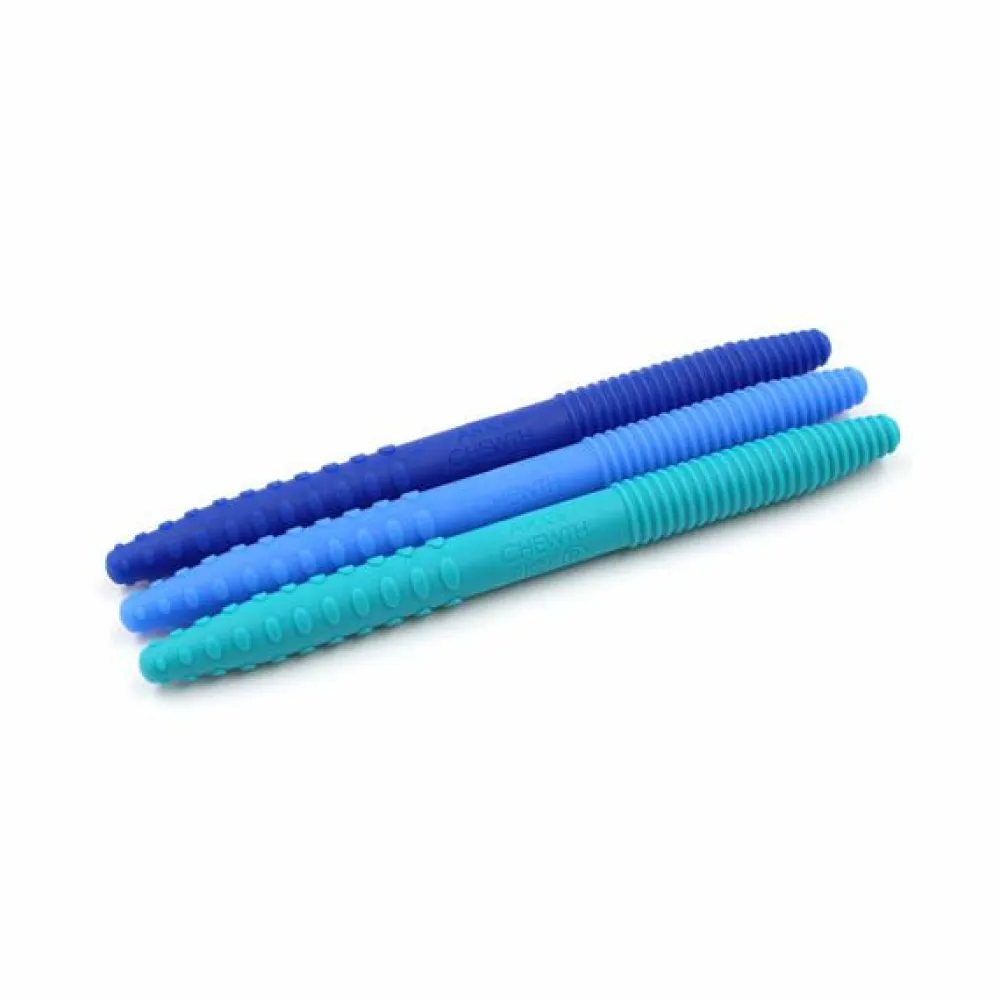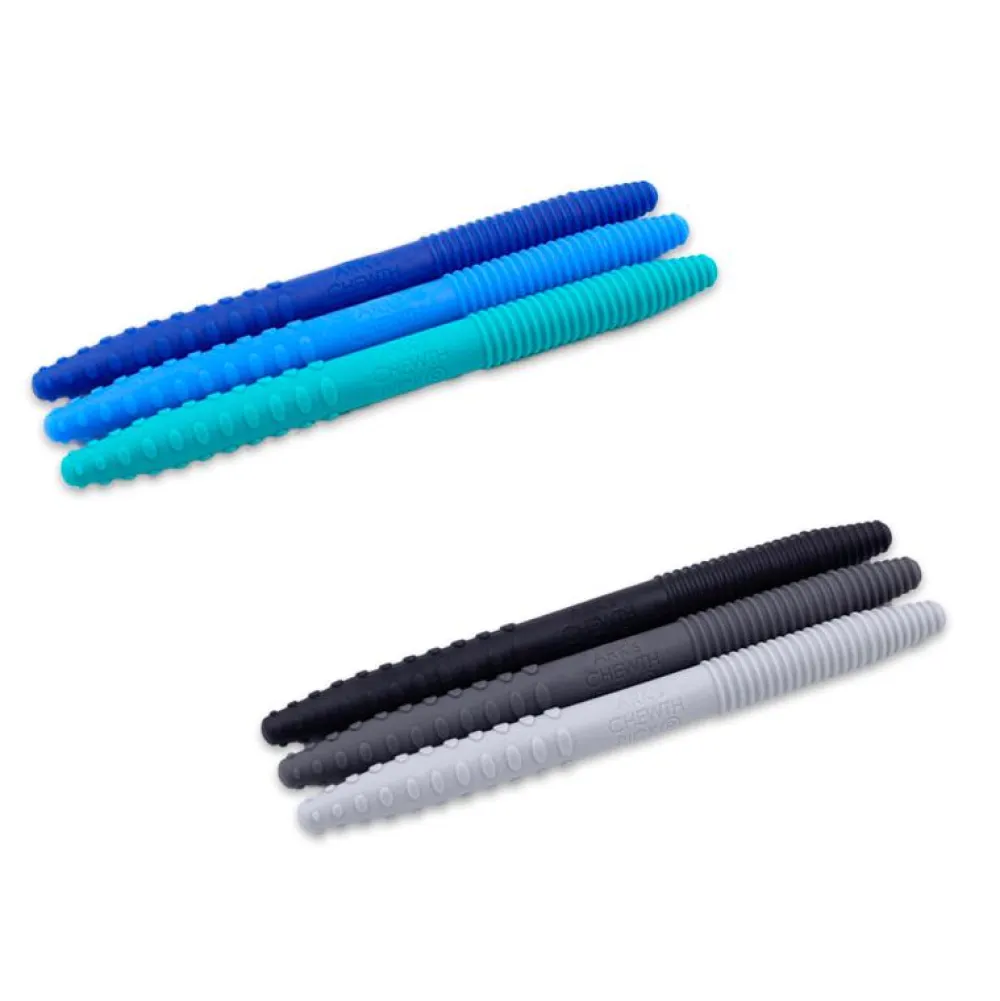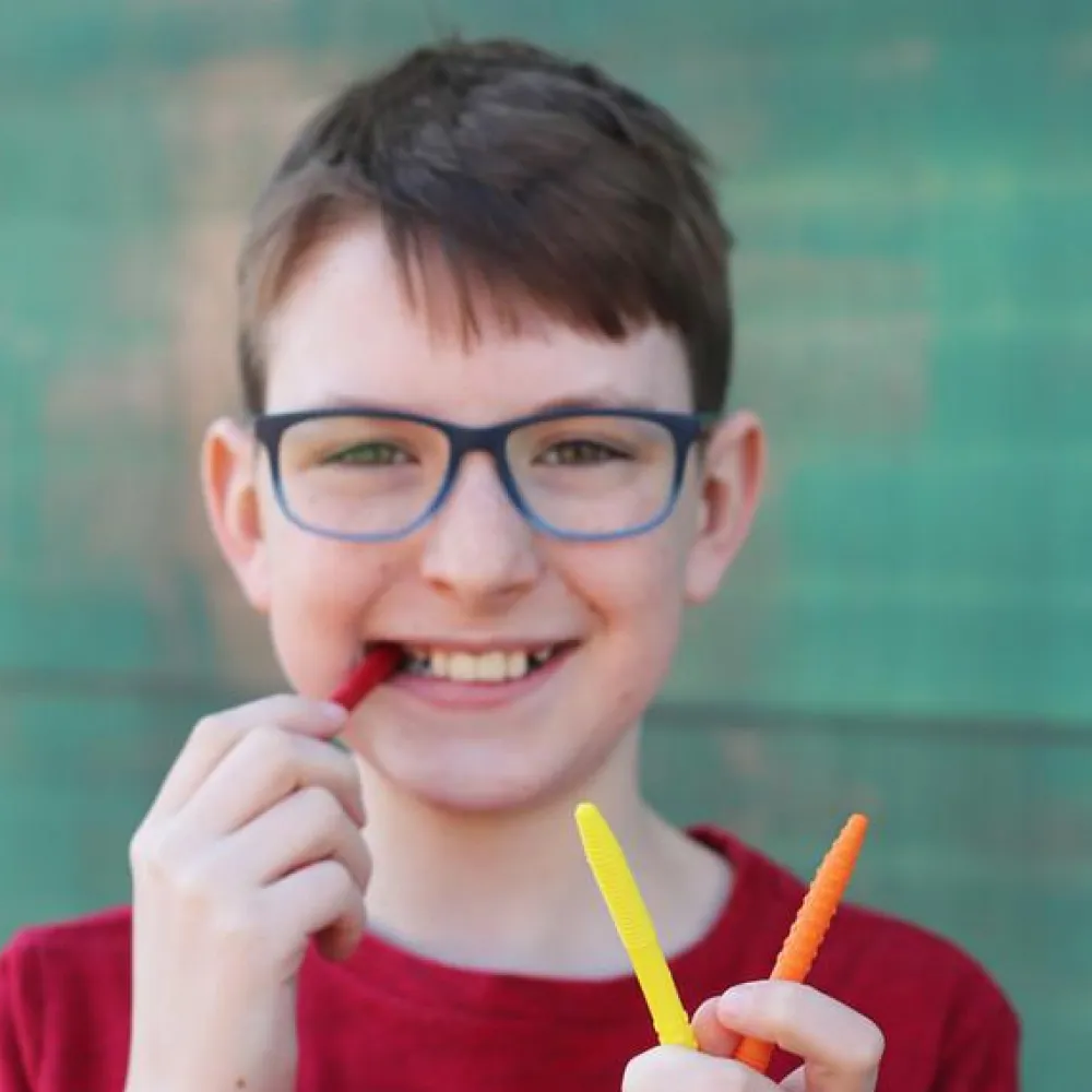 Sensoriske tyggeredskaber er en fællesbetegnelse for tyggehalskæder, bidesmykker, bidelegetøj og vibrerende redskaber til børn, der har så stært tyggebehov, at der skal særlige redskaber til. Nogle børn gumler, tygger og sutter for at berolige nervesystemet via de mange nerve-ender i tandrødderne og i mundhulen. Det er ikke farligt, men hvis du gerne vil skåne bluseærmer, puder og blyanter, så kan et sensorisk tyggeredskab være et forslag. Vores tyggeredskaber er hygiejniske og sikre at anvende.