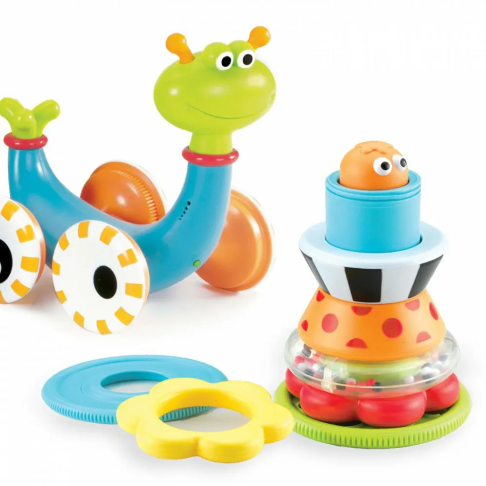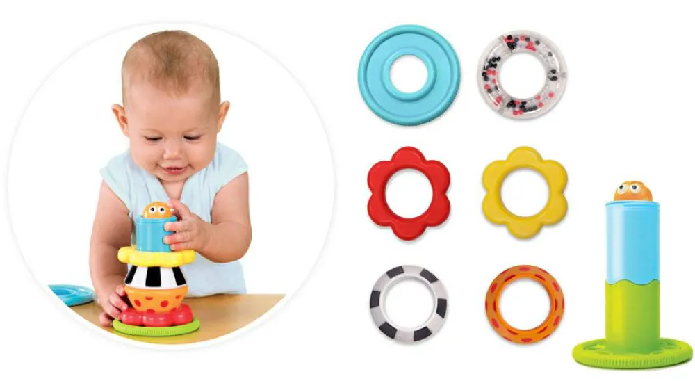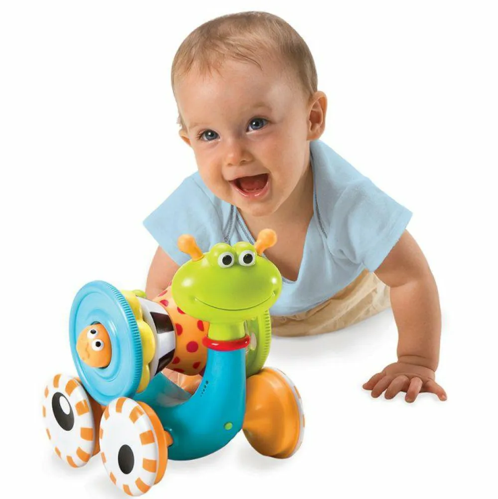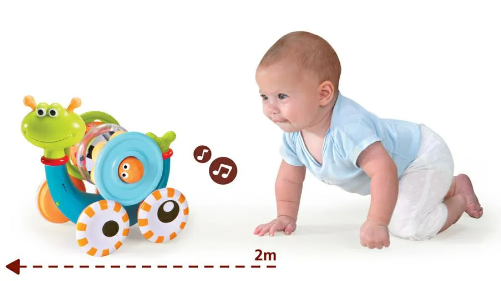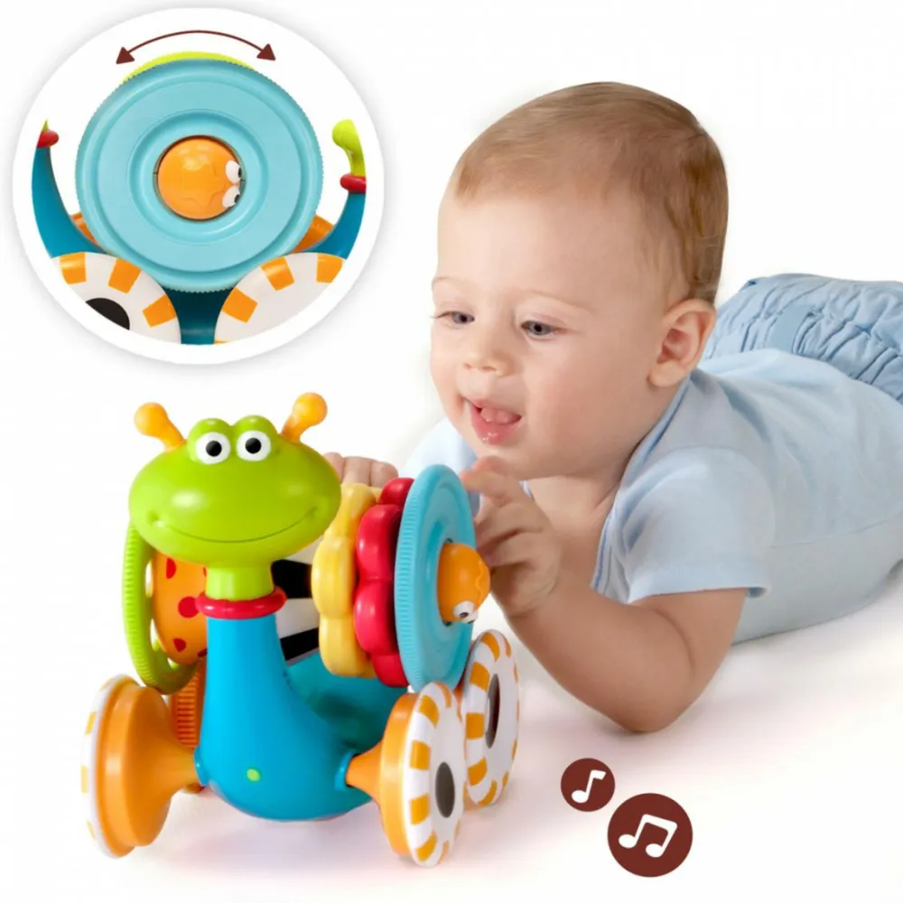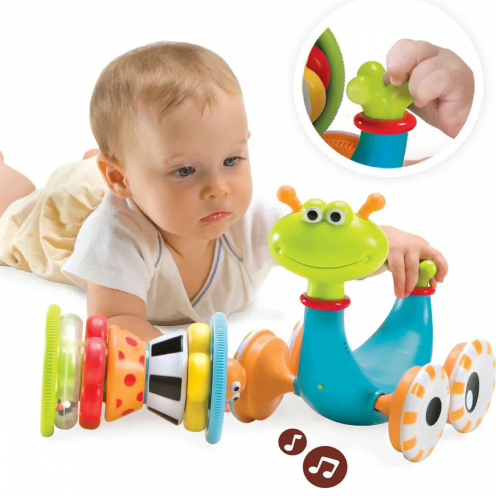 Sneglen spiller en melodi, når den triller fremad. Dens hus kan stilles på højkant, og så kan dit barn hygge sig med at tage alle ringene af og forsøge at samle dem op og stable dem på pinden i midten. Ringene har forskellige udformninger og farver.