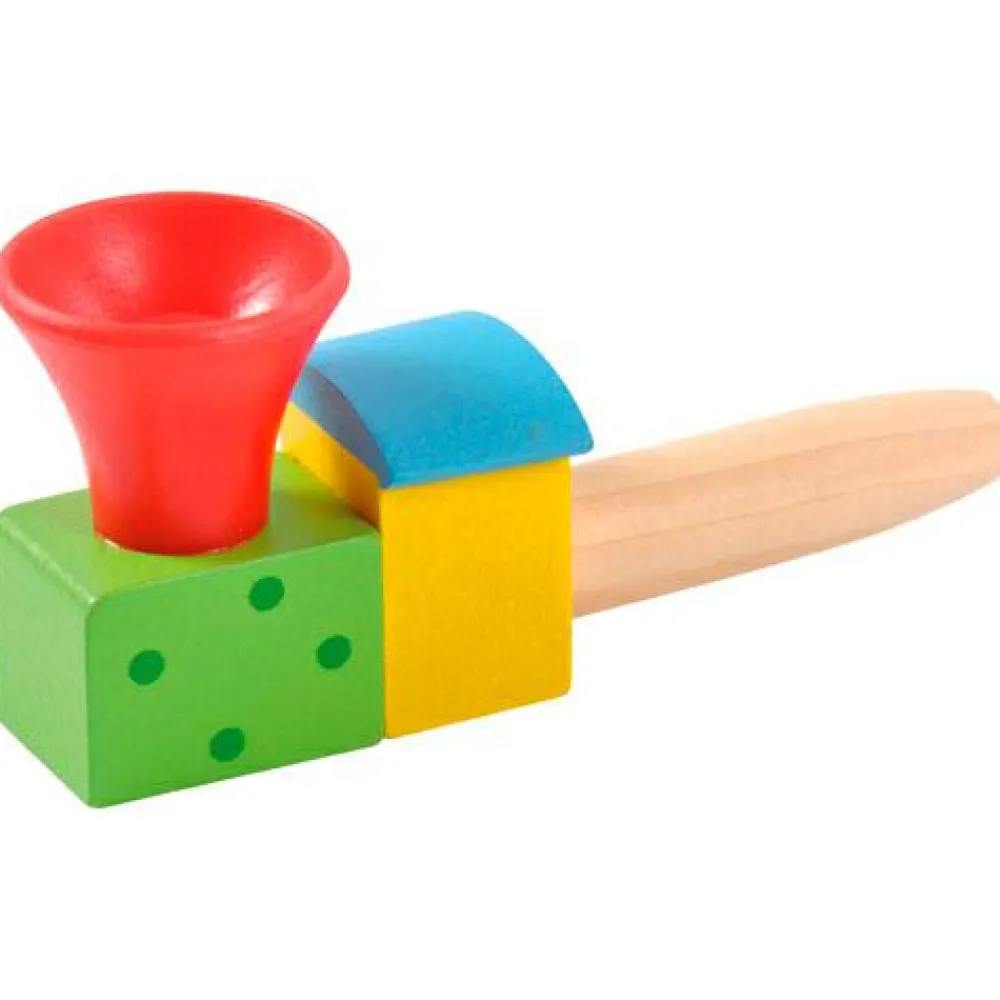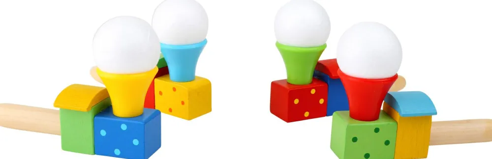Når dit barn puster ganske stille og roligt i røret bag lokomotivet letter bolden en smule, og på den måde kan dit barn få bolden til at rotere i skorstenen.