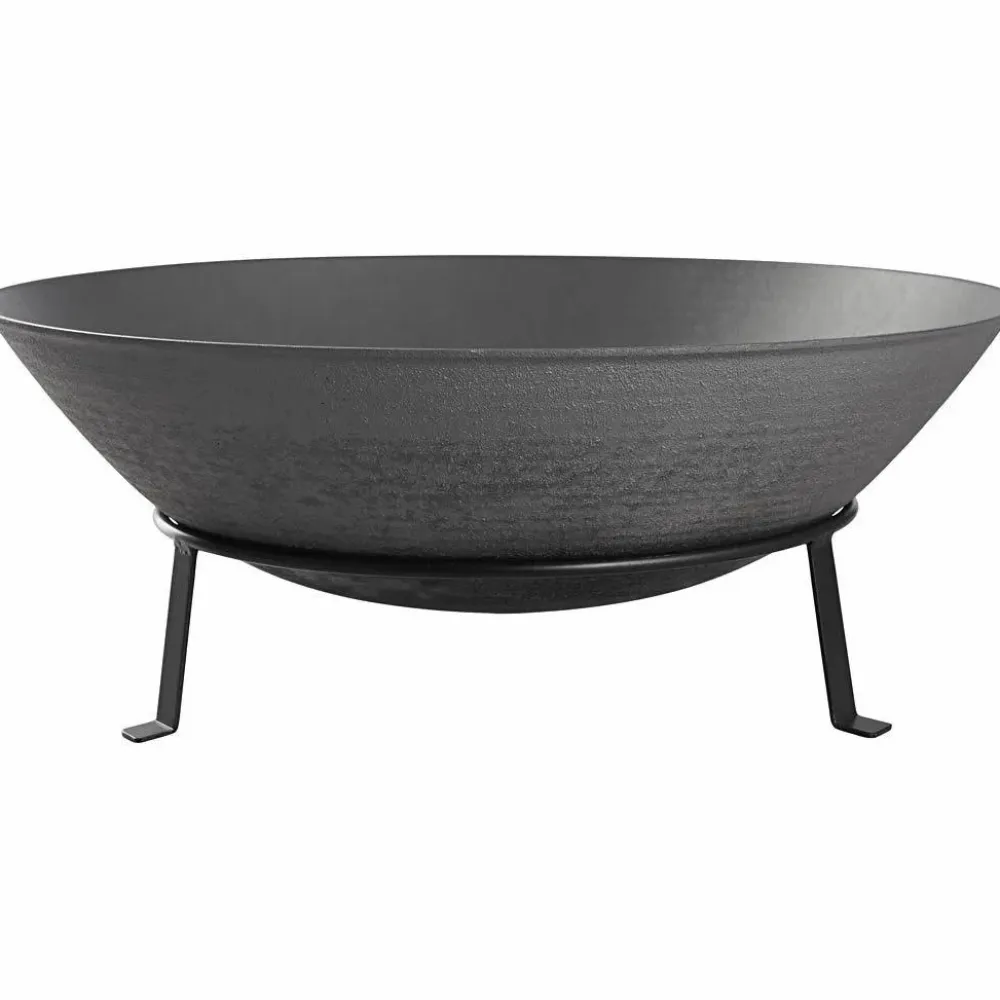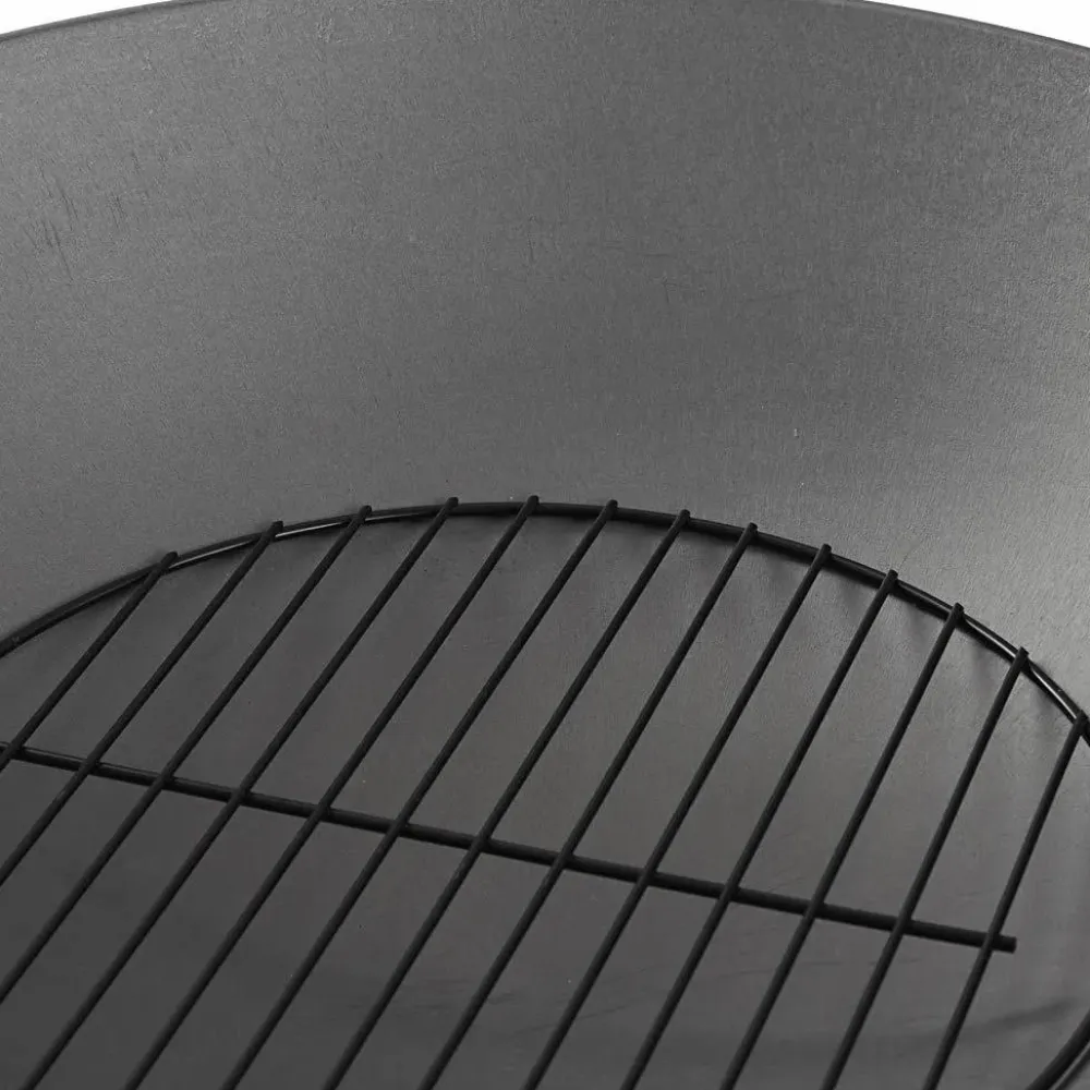 Dette bålfad er af støbejern og kan tåle stort set alt. Risten er til at ligge i bunden, og så stabler I brænde ovenpå. Der er ikke huller i bunden af fadet, så det skal have bunden i vejret, når det er kølet af, for at undgå, at der danner sig en lille sø i bunden af det.