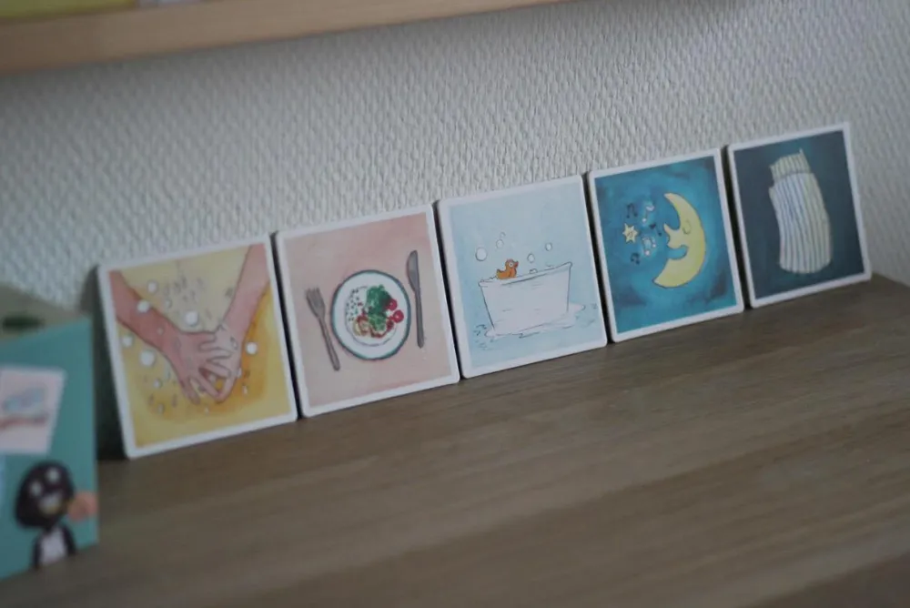 Disse piktogrammer er udviklet i samarbejde med en dansk psykolog med fokus på børns hverdag. Fokus er på at piktogrammerne er genkendelige for det enkelte barn.
