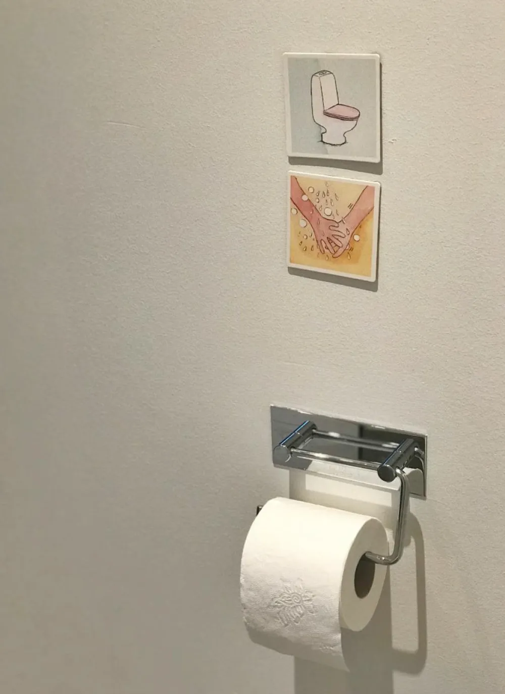 Der er 4 stk blanke fliser med også, som I selv kan tegne. Piktogrammerne har glatte bagsider og kan sættes op med sticky tag (elefantsnot).