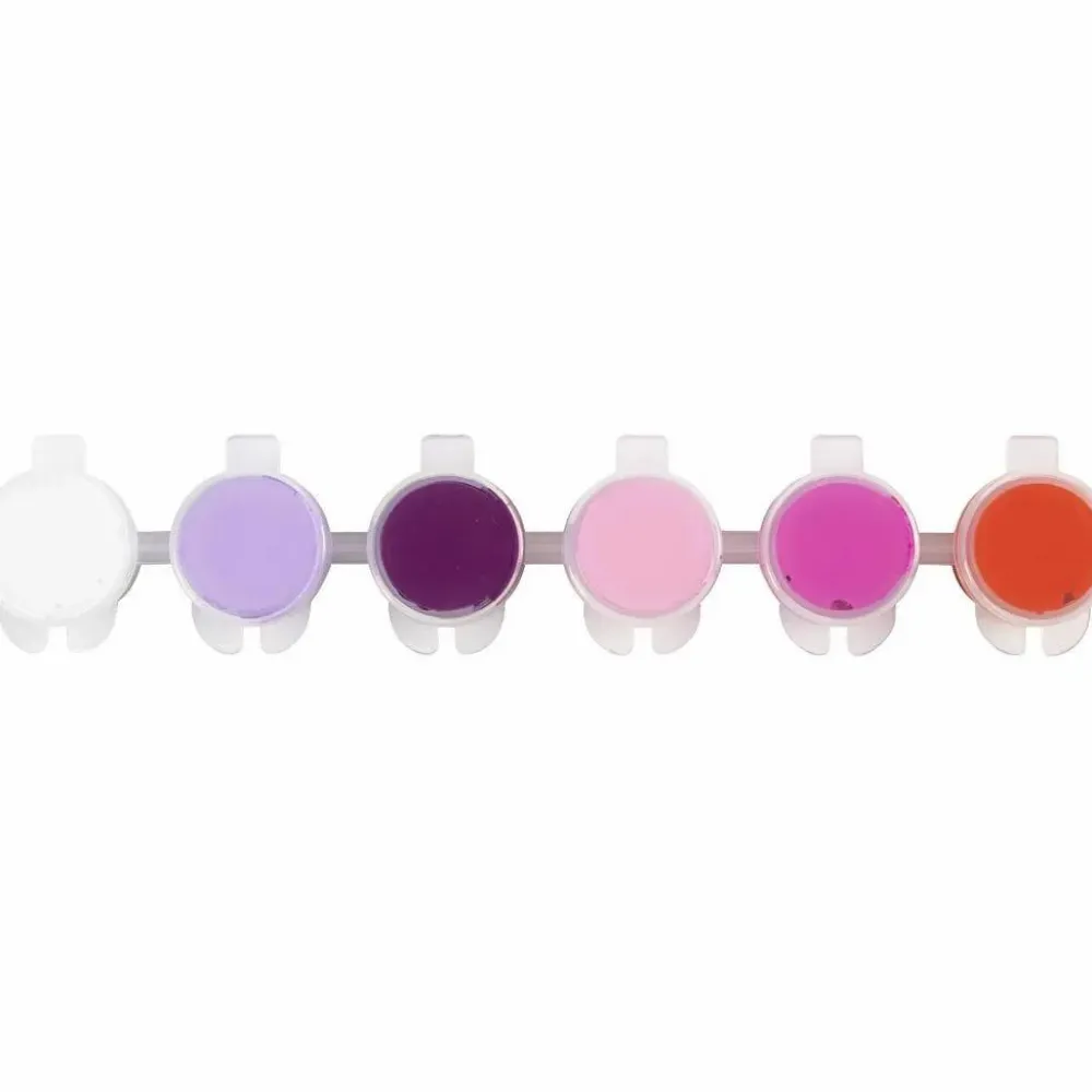 Her er 6 små bøtter med akrylmaling i lyserøde, rød og lilla nuancer.