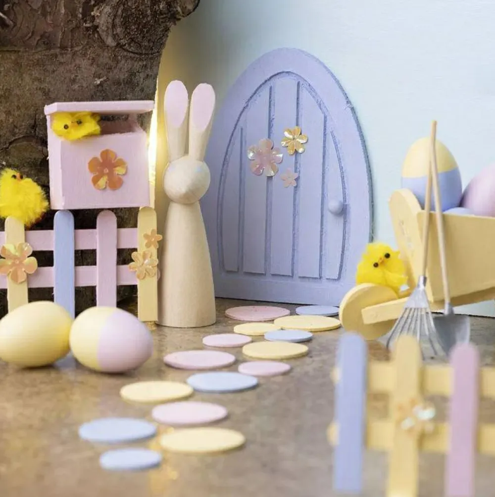 Måske beder haren om, at I laver den et stakit ud af ispinde og dekorerer det med de fine farver. Og æggene i plast skal da også pyntes.