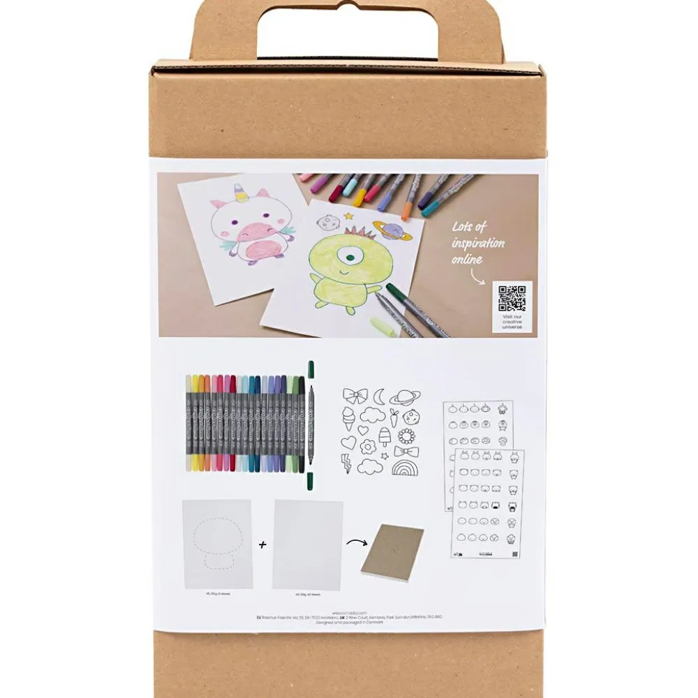 Tegnetuscher, stickers til farvelægning, tegneblok med hjælpelinjer og vejledning med tegnetrin.