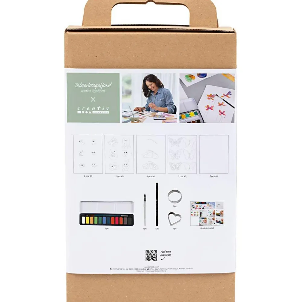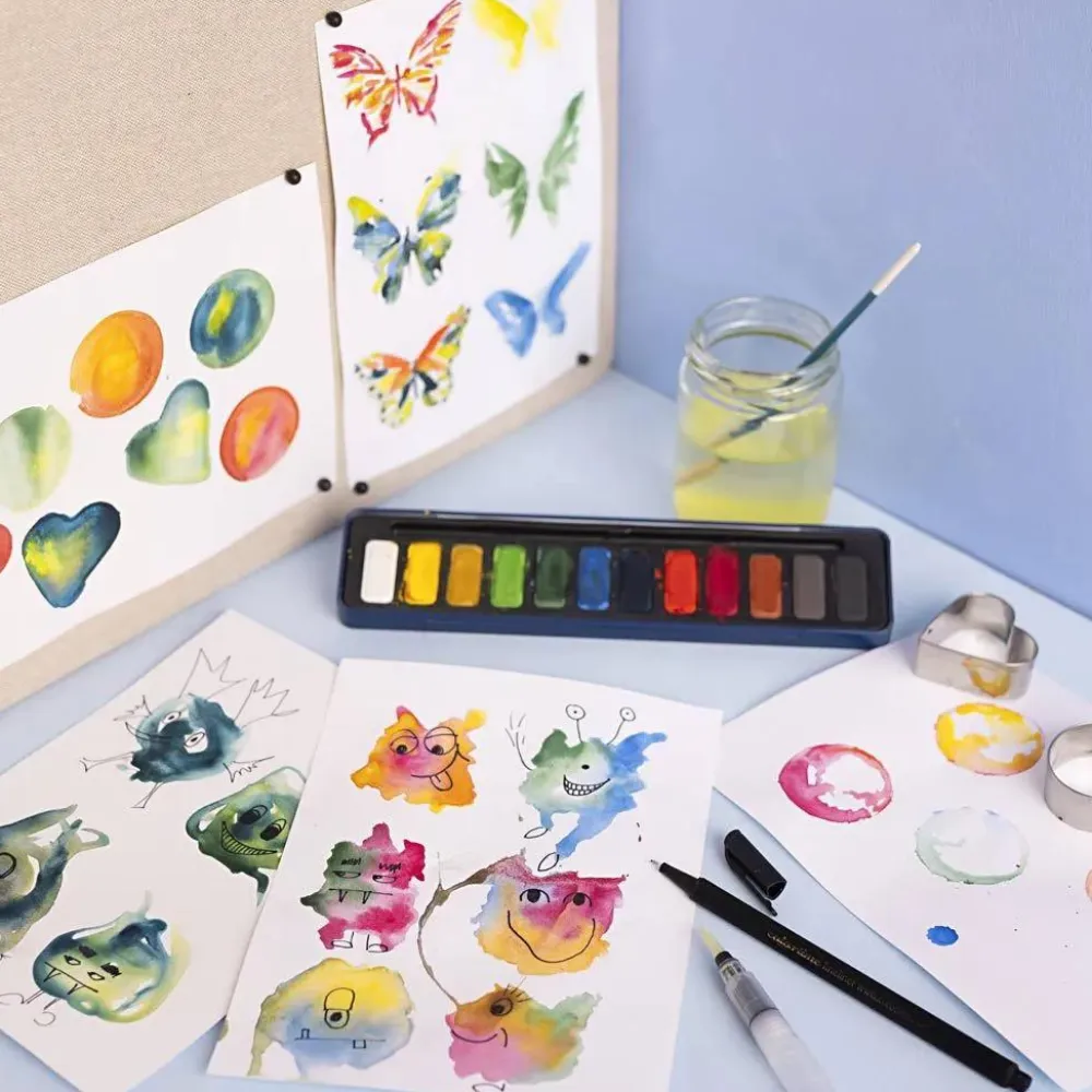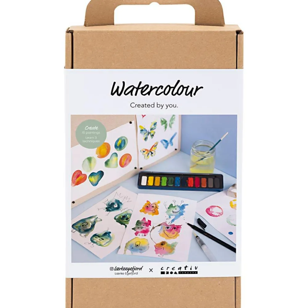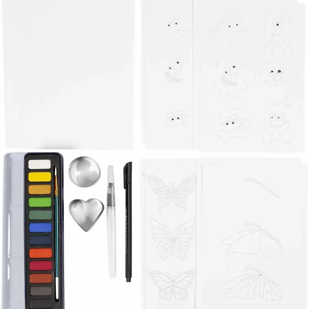Bliv fortrolig med akvarelmaling med dette læringssæt, hvor I kan lege med at blande farver, arbejde ed vådt-i-vådt og farvelægge skøre monstre og flotte sommerfugle.