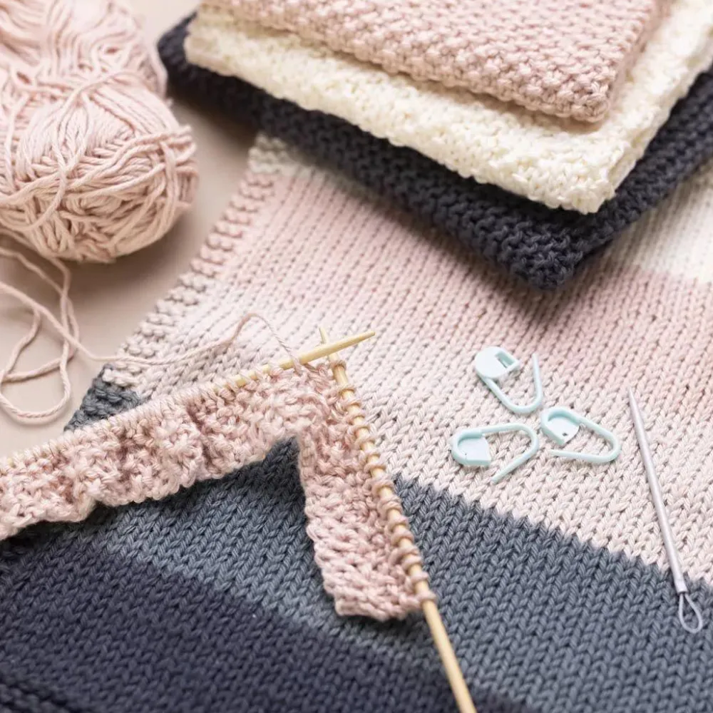 Du får også maskemarkører, målebånd, garnnål og en stofpose med at have det hele i.