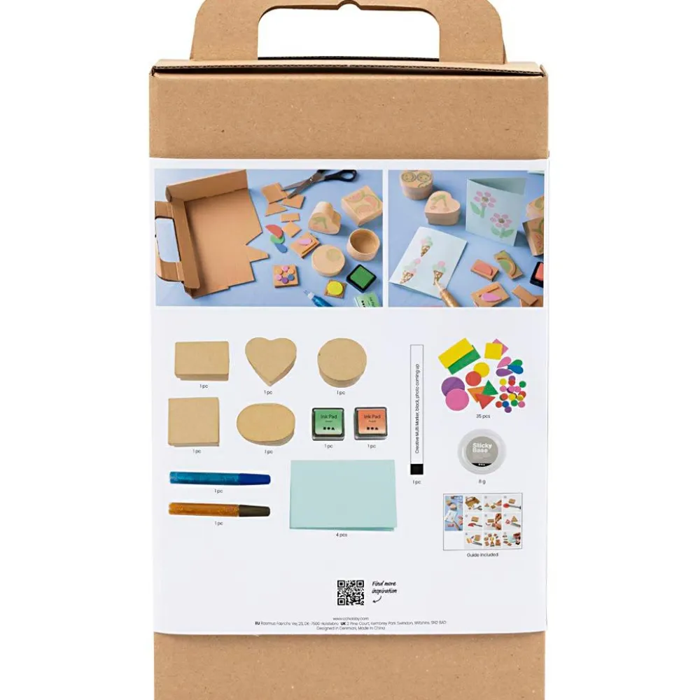 Du får alt du skal bruge af Sticky base, æsker og kort, mosgummi til skumfigurer, stempelpuder, glimmerlim og tus. Vejledning følger også med.