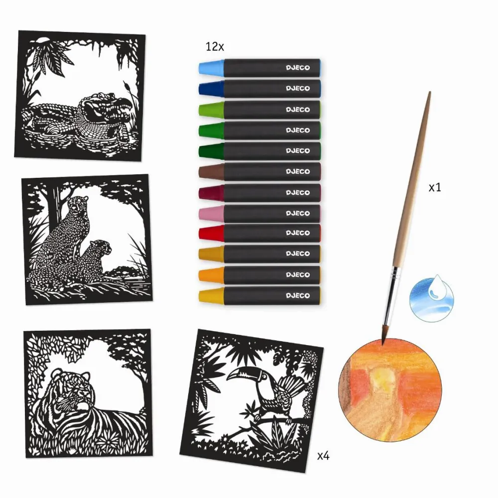 Når dit barn er færdig med baggrunden, folder I det laserskårede sorte motiv med dyr ned over baggrunden. Voila! Så er motivet pludseligt ophøjet til et helt nyt mesterværk.
