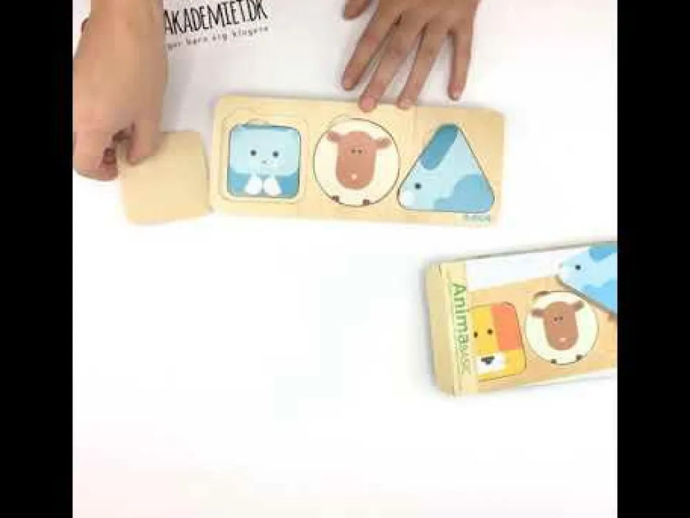 Det søde babypuslespil med mange forskellige dyrebrikker er en godt udgangspunkt for at tale om dyr, og om det ene eller det andet skal ligge øverst, i midten, eller nederst.