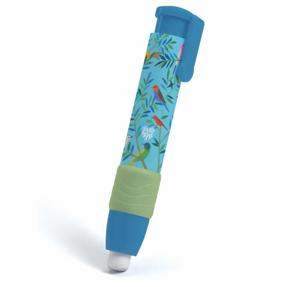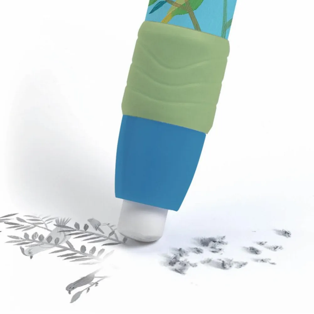 Tryk i tippen og viskelæderet kommer ud i bunden. Som en stiftblyant – bare med viskelæder.