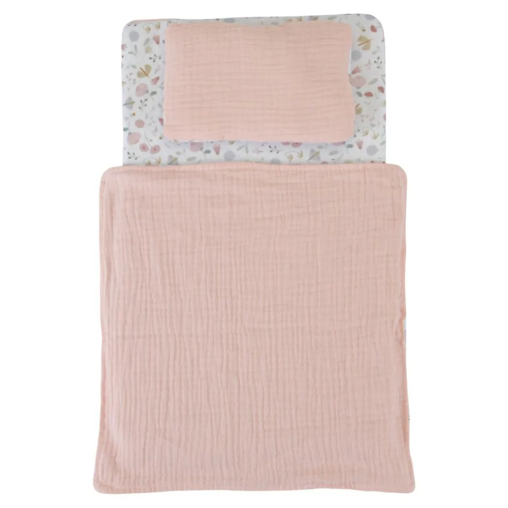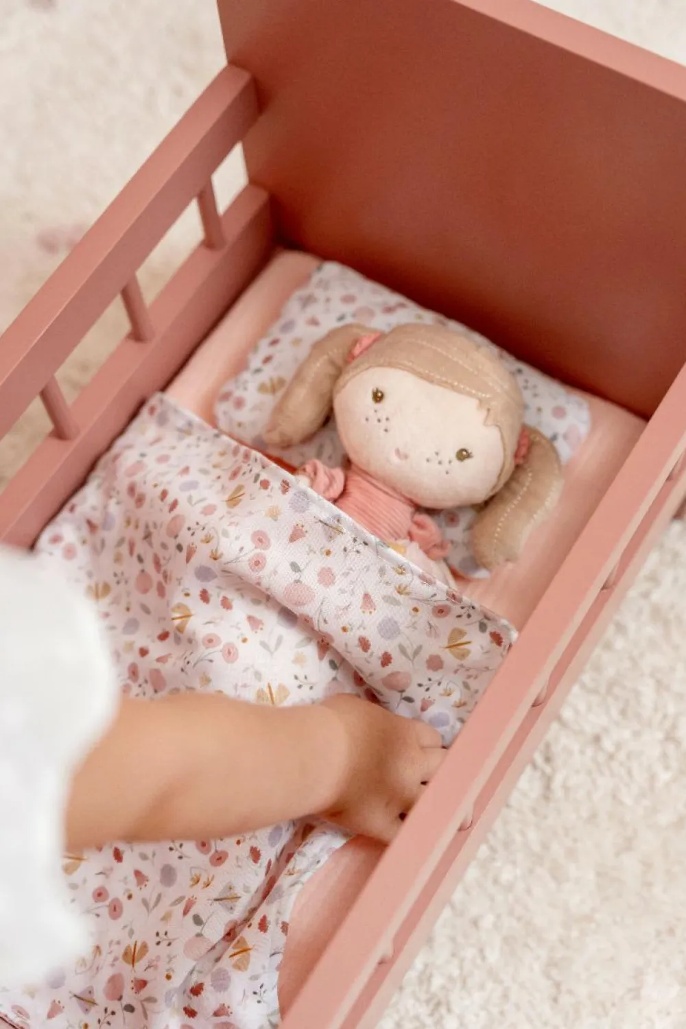 Når dit barns dukke skal puttes, så skal det da være i denne fine seng af træ. I det yndigste sengetøj med dyne og pude.