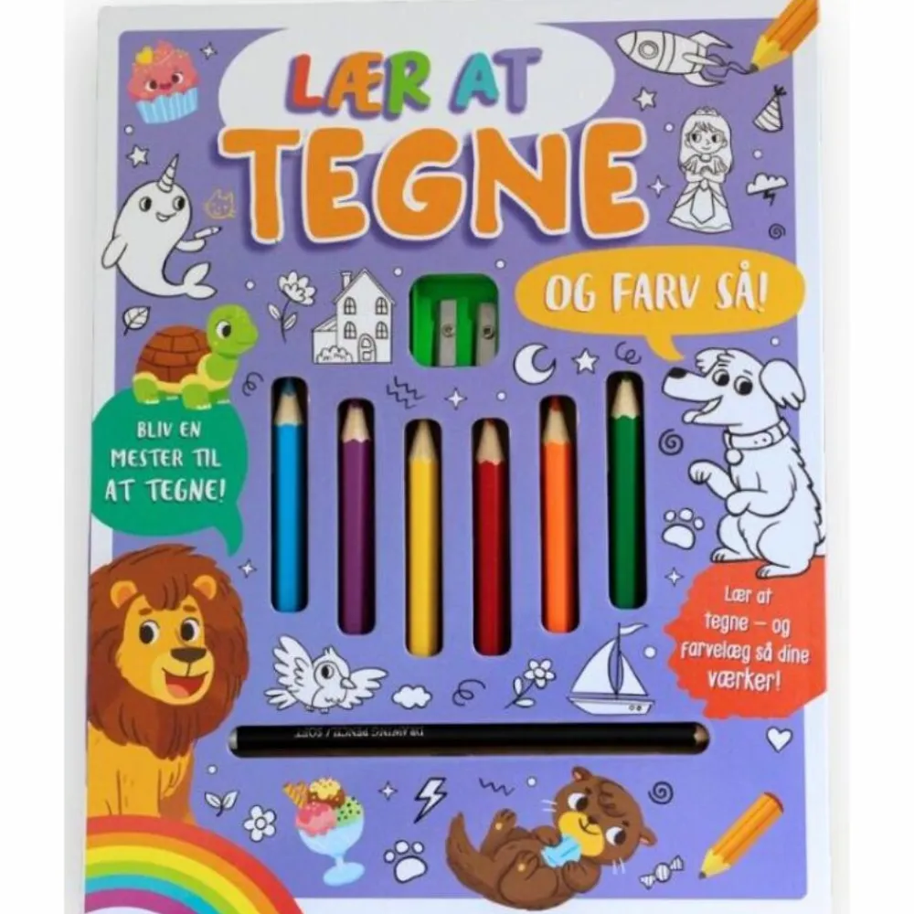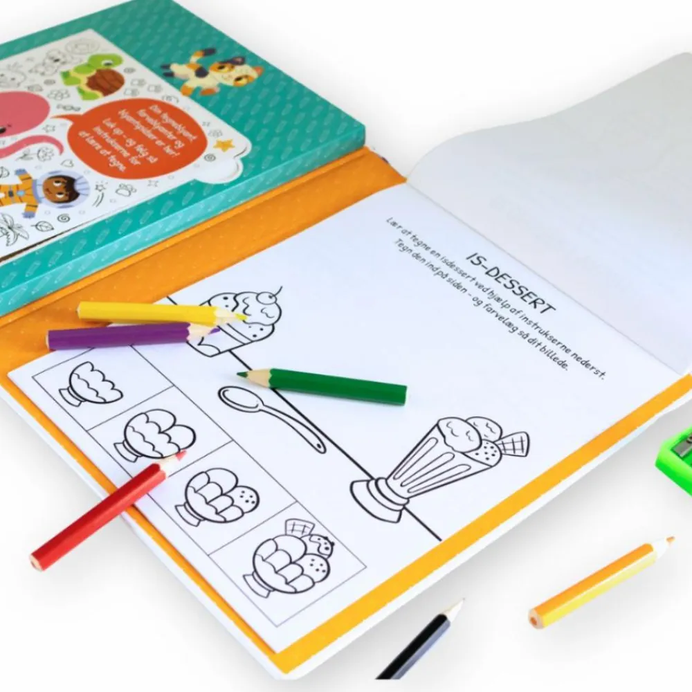 Der følger blyant, farveblyanter og blyantspidser med, så der er alt, dit barn skal bruge for at komme i gang.