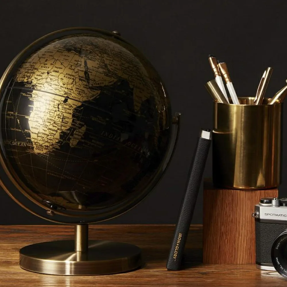 Denne globus er anderledes, for alle jordens lande er markeret med guld på en sorg baggrund. Det giver en hel anden oplevelse af kloden, og det ser meget flot ud. Teksten på globussen er på engelsk.