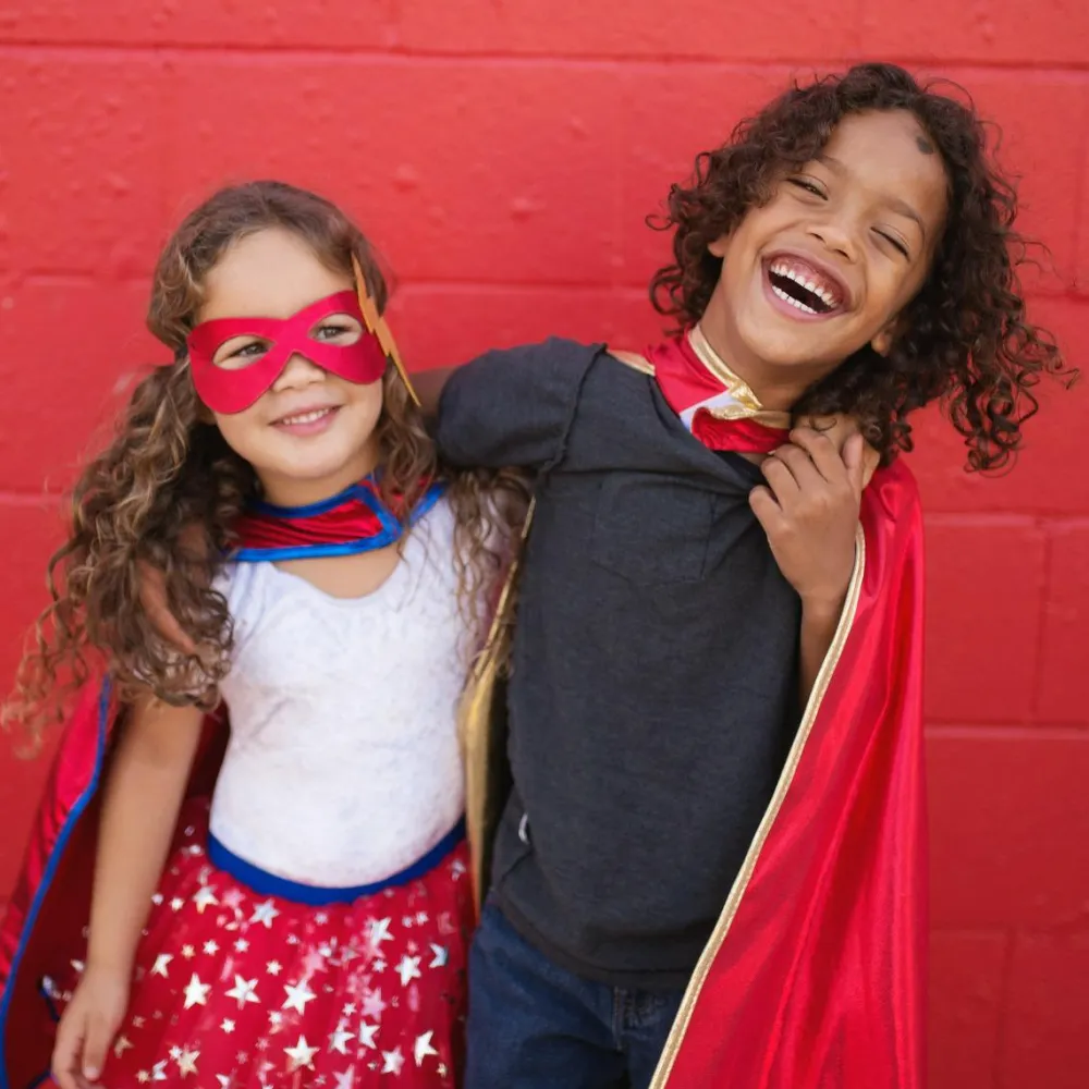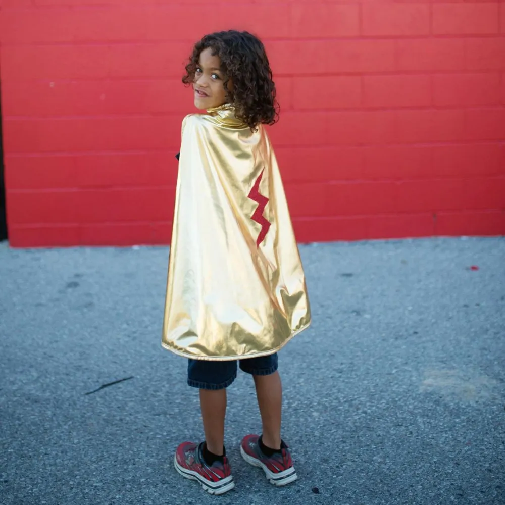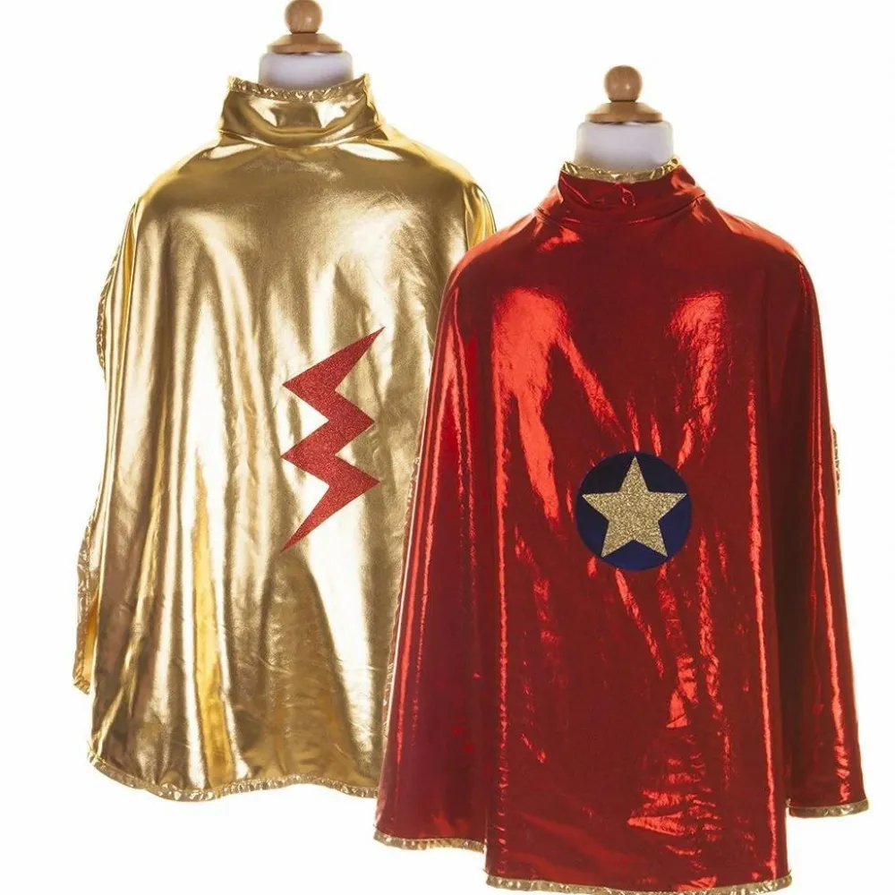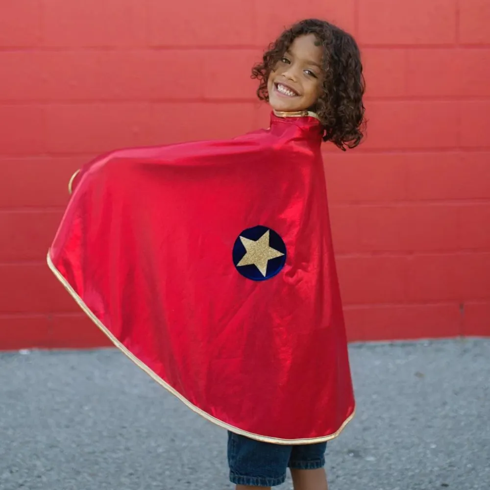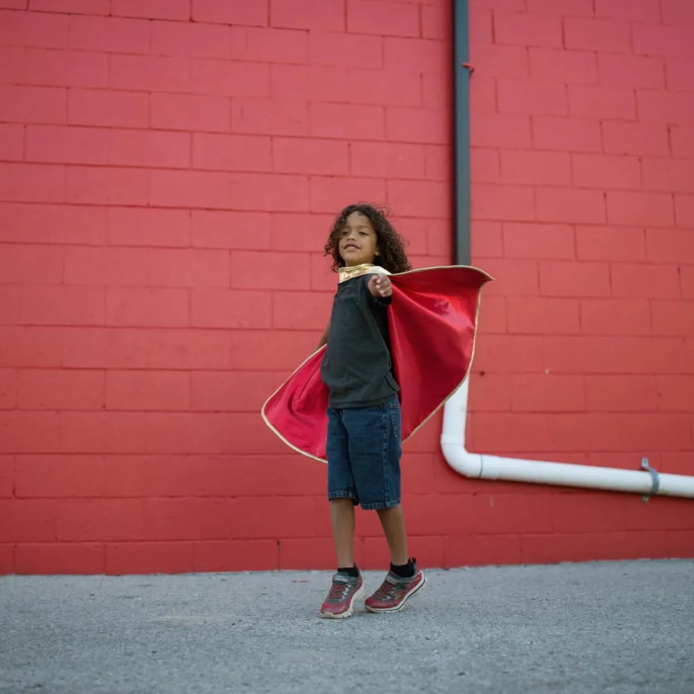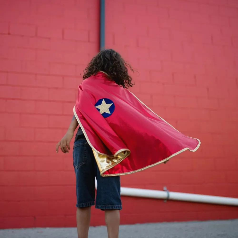 Denne smarte udklædningskappe er vendbar, så dit barn selv kan vælge, om den røde side eller siden med guldfarve skal vende udad.