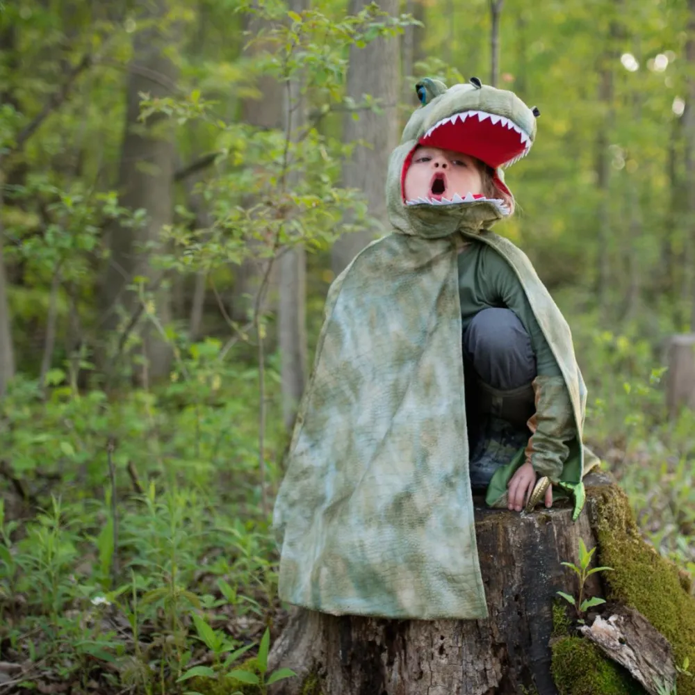 Denne praktiske og behagelige kappe med tilhørende klør i form af ærmer og et mundstykke, der kan tages af, gør det til en leg at forvandle sig til en drabelig fortidsdino med smag for små og store skabninger. Både små og store søskende skal bare passe på!