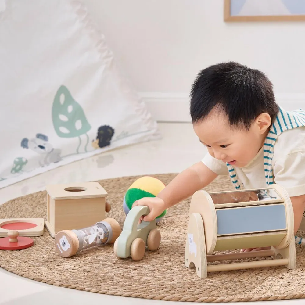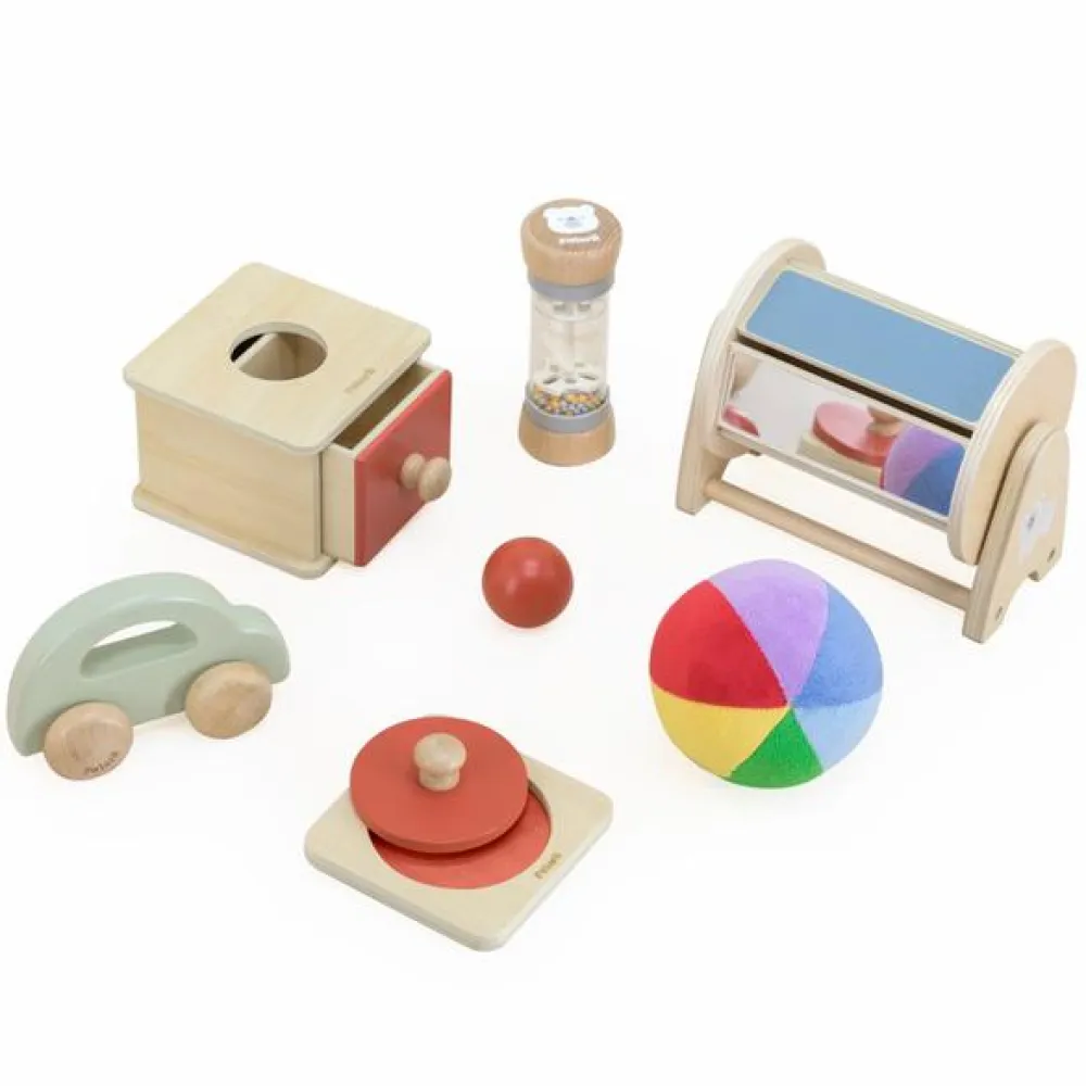 En skøn samling af trælegetøj, der er særligt udvalgt til at hjælpe dit lille barn med at udvikle de kompetencer, som børn ml 6 og 12 måneder er klar til at prøve kræfter med.