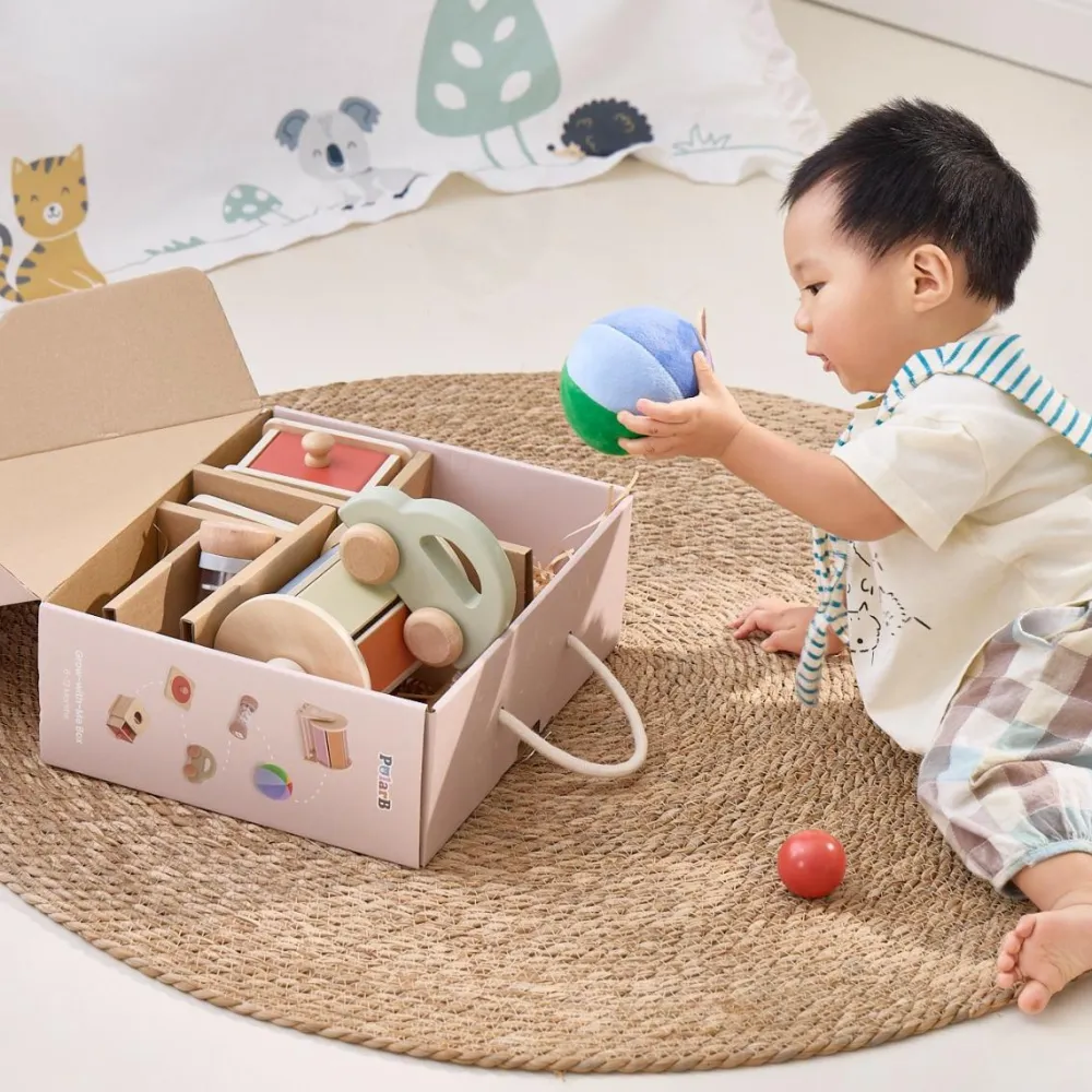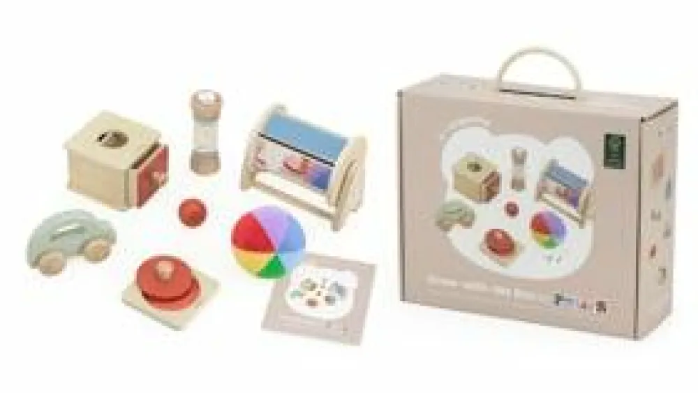Her anbefaler vi Grow-With-Me. Det er en serie af legetøjskasser med forskellige legeredskaber, der er særligt tilpasset de udviklingstrin, børn i forskellige aldre har. Alt er af FSC-certificeret birketræ og leveres i en æske af pap med træspåner som kassefyld. Der findes Grow-With-Me kasser fra 0-3 år.