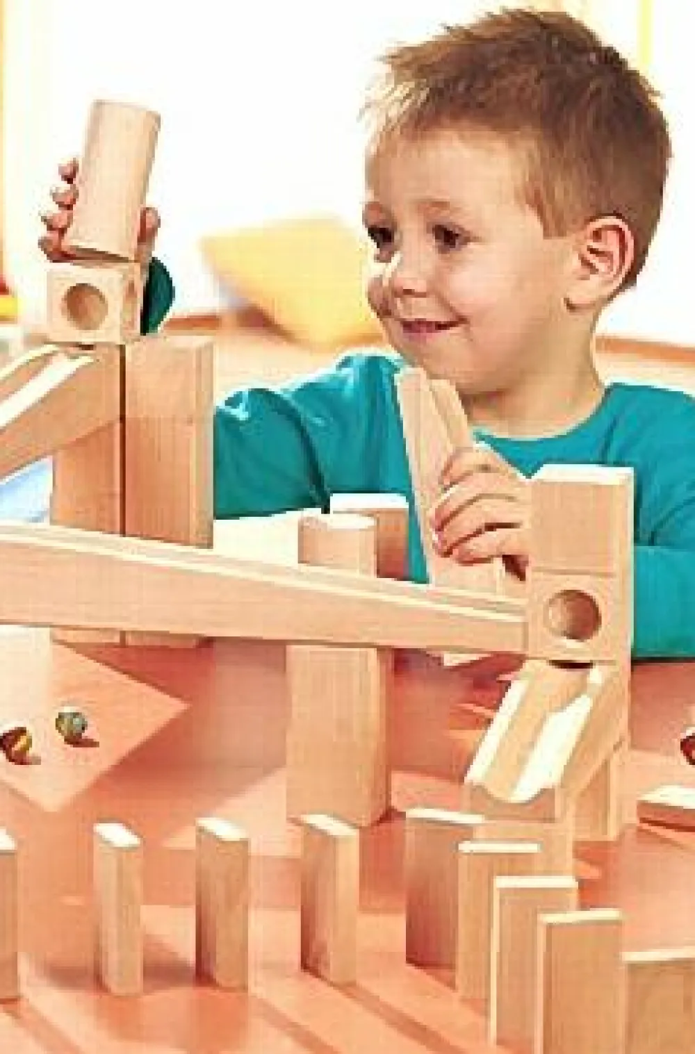 Begejstringen er stor, når kuglen suser ned ad banen. Kuglebanen kan bygges på det niveau som passer barnet, så derfor er det en meget alsidig leg, der holder i årevis.