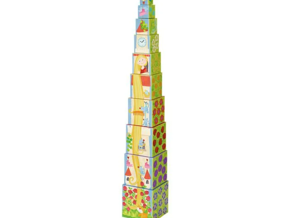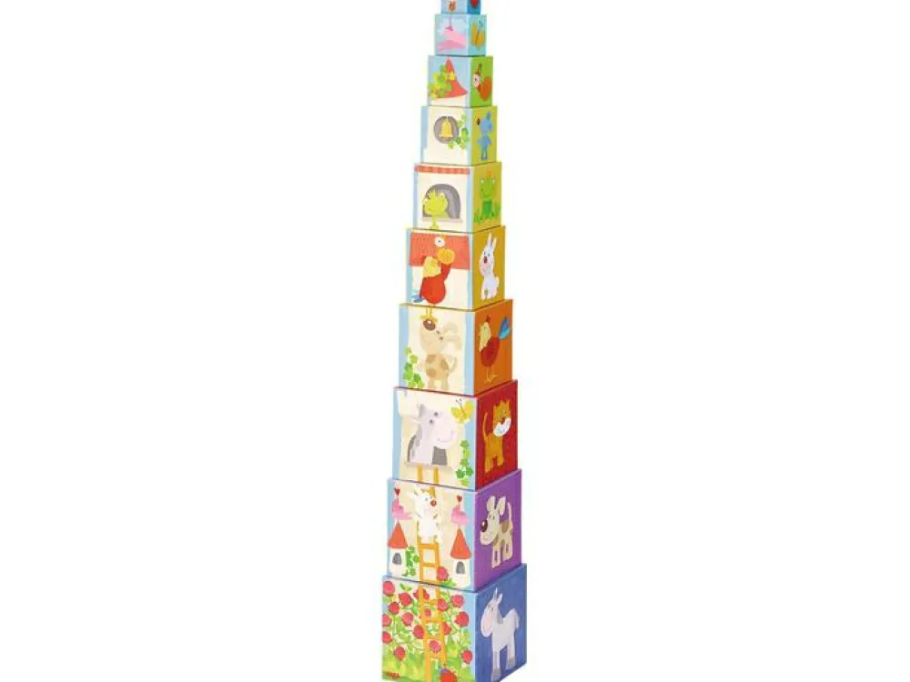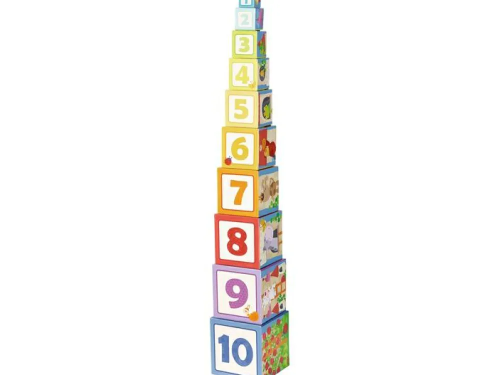 Når dit barn forsøger sig med at stable kasserne ovenpå hinanden i den rette rækkefølge, vil billedet komme frem. På de andre sider er der dyr, blomster og tal, så dit barn kan også lære at tælle til 10, når I bygger det høje tårn af klodser.