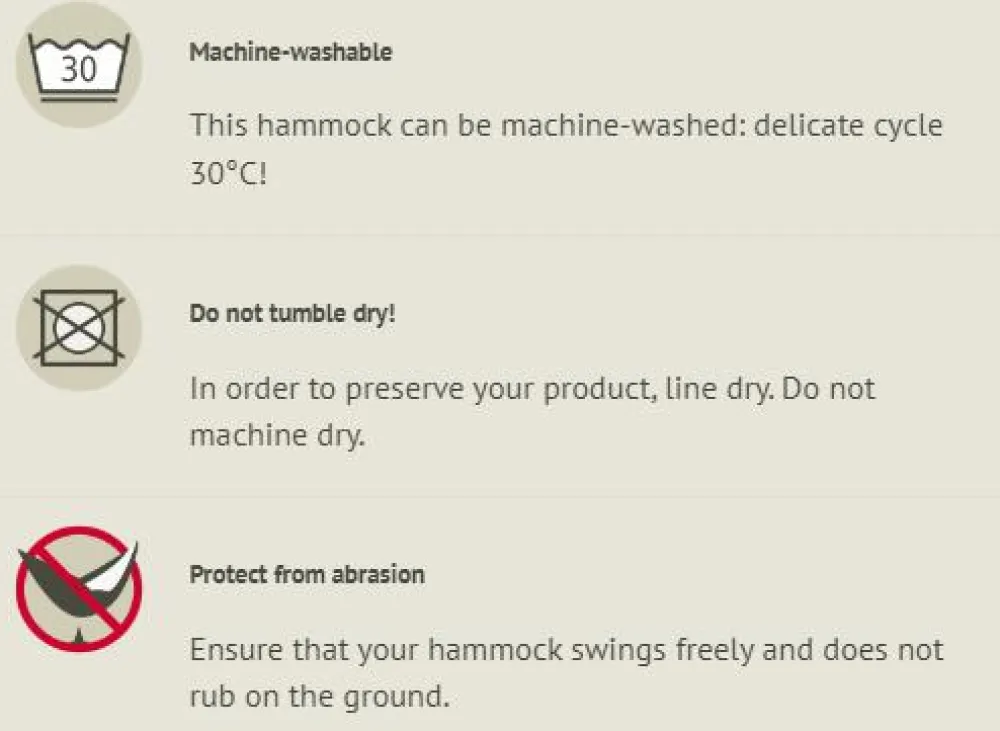 Du kan let tage delene til ophænget af og vaske stoffet i vaskemaskinen på 30 graders skåneprogram. Det er praktisk, hvis dit barn lige tog et glas saft eller en mad med i hængekøjen.