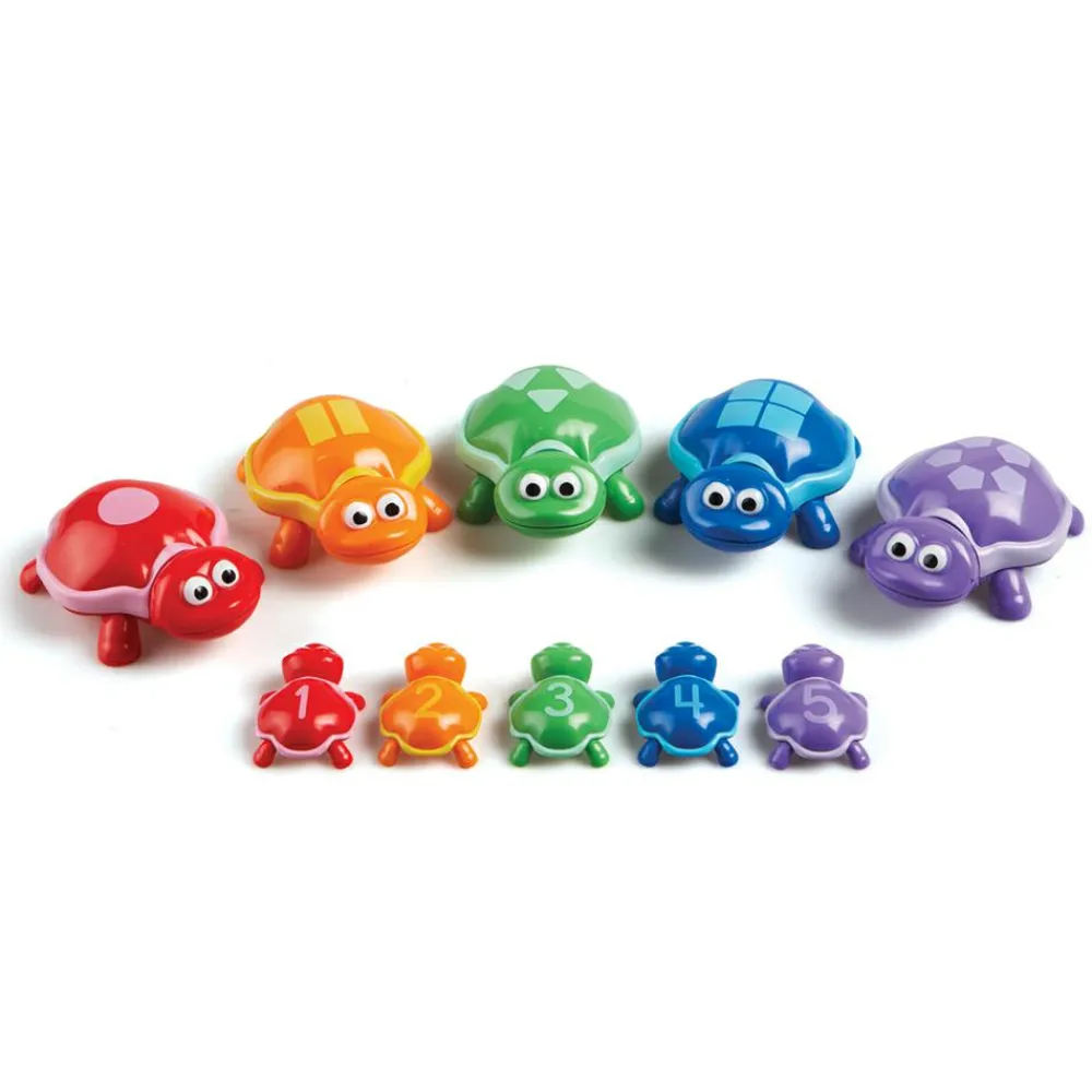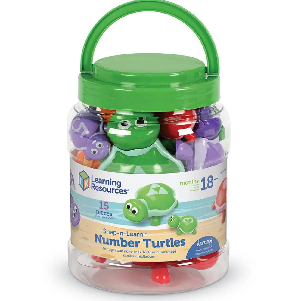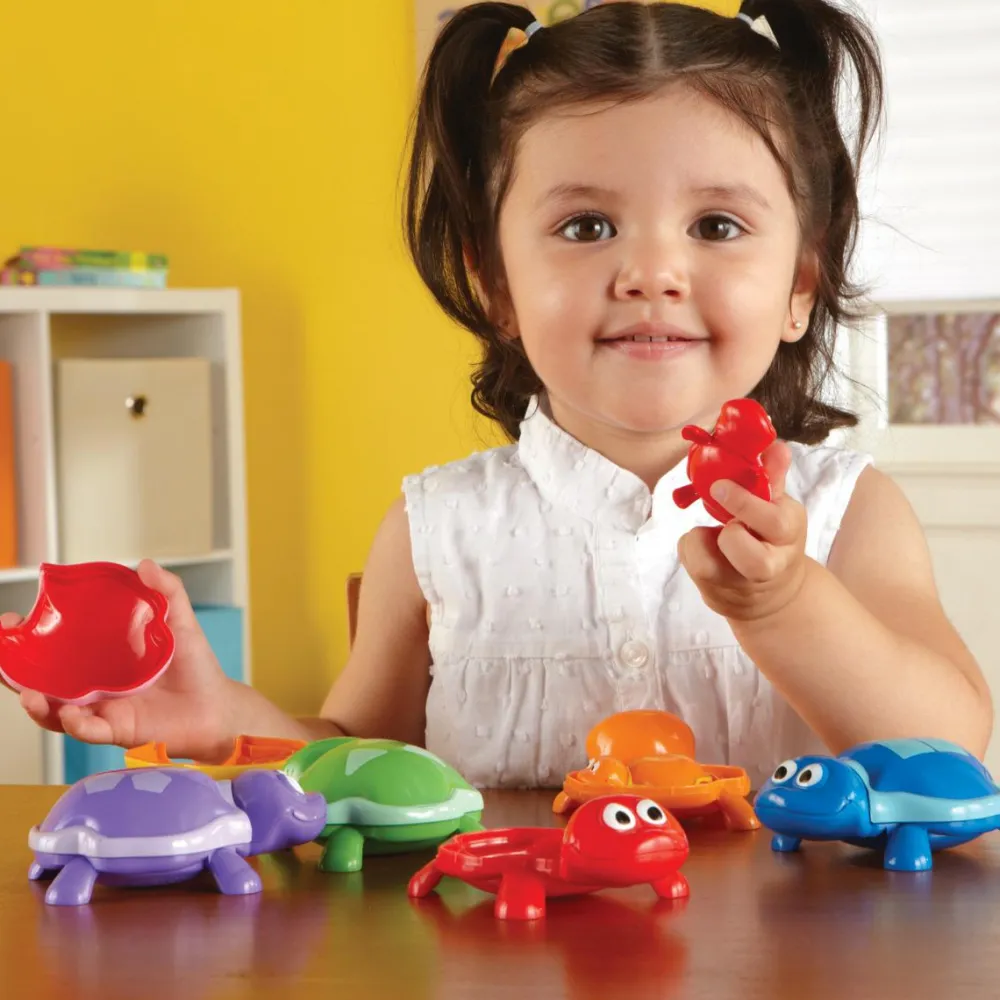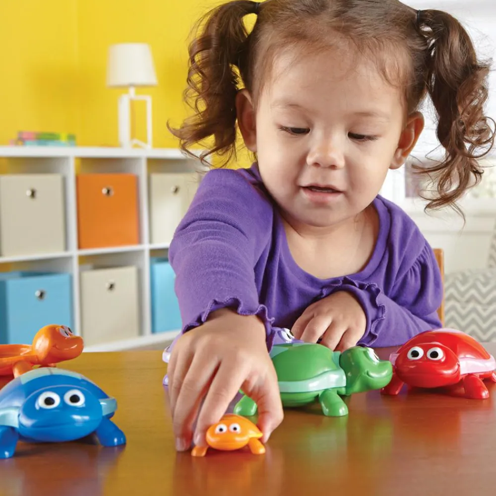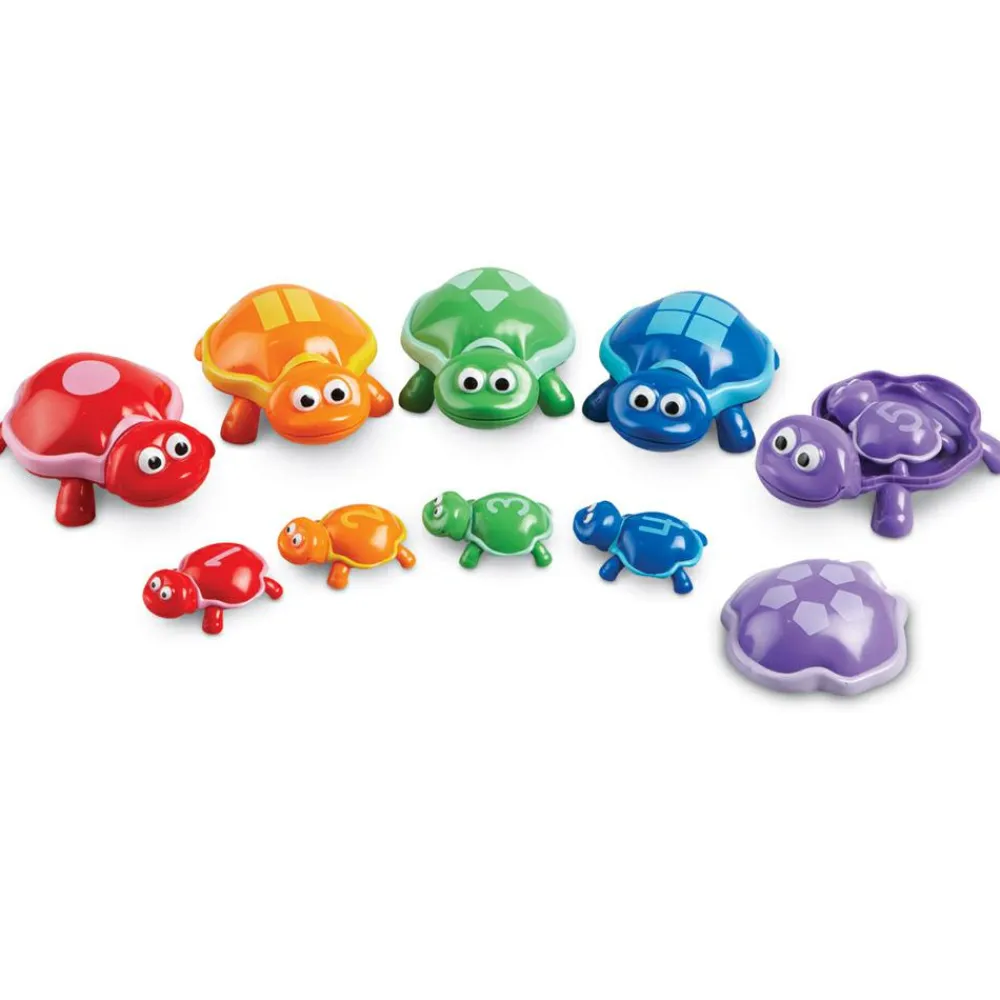 Her er 5 forældre-skildpadder i hver sin farve og med skjold, der kan tages af. Deres små skildspaddebørn har et tal og en farve, der svarer til en af de voksne skildpadder.