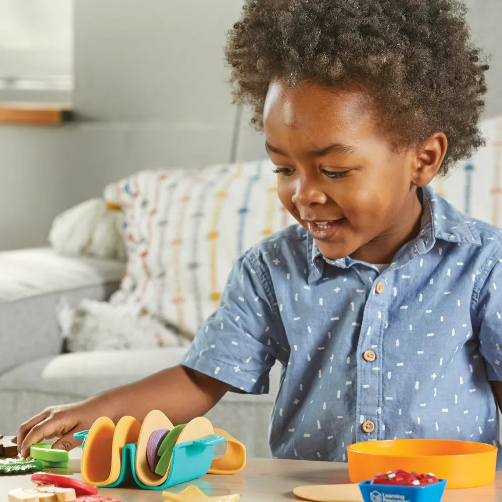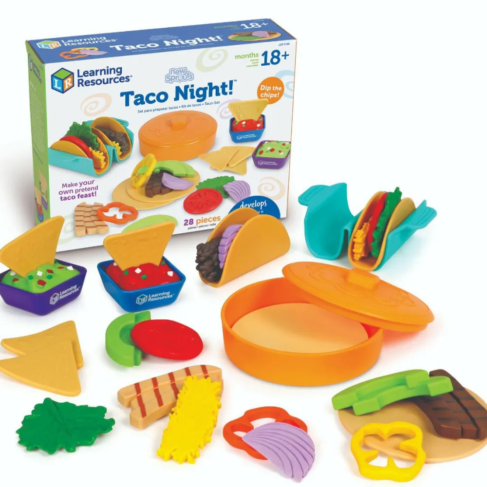 Så kan det blive taco-tirsdag hver dag i legekøkkenet eller dit barns improviserede café med servering af tacos med holder, tortillas i flere varianter, nachos, ris, tomater, løg, guacamole og salsa, som man kan dyppe i og hvad der ellers hører sig til.