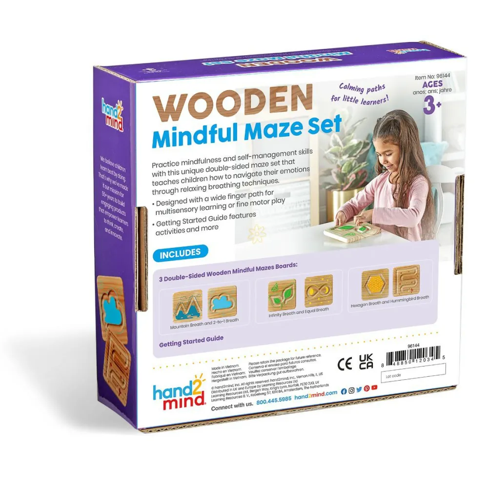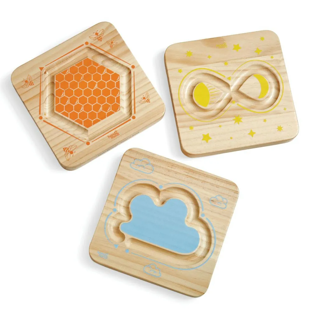 De tre plader har taktile fingerstier på begge sider og der følger engelsk vejledning med, hvor du får ideer til, hvordan man kan bruge de forskellige mønstre til forskellige åndedrætsøvelser.