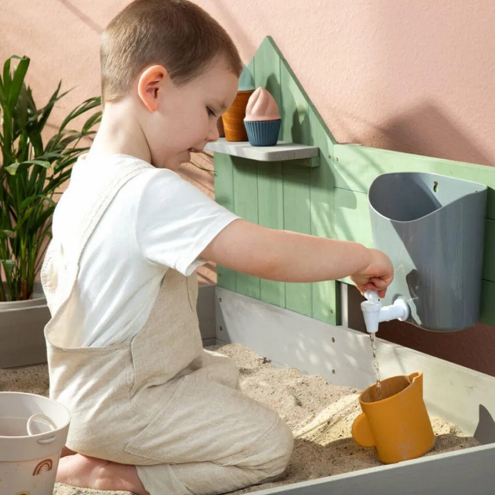 Hæld vand i vandtanken, så dit barn selv kan lege hældeleg og bage sandkager med vand i.