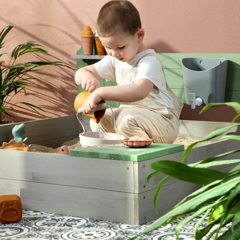 Sandkassen er ikke så stor, så den kan passe ind både på terrassen, på større altaner og i haven, så dit lille barn kan lege under opsyn tæt på voksne.