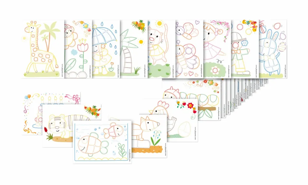 Når dit barn dekorerer et kort, fungerer det ligesom at lave mosaikker. De forskellige kort forestiller dyr og børn, og alle kort har forskellige felter med et farvet omrids.