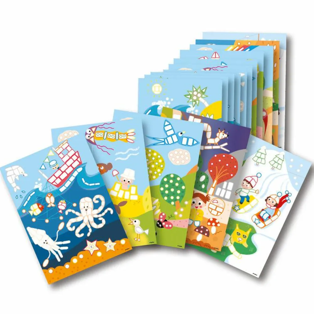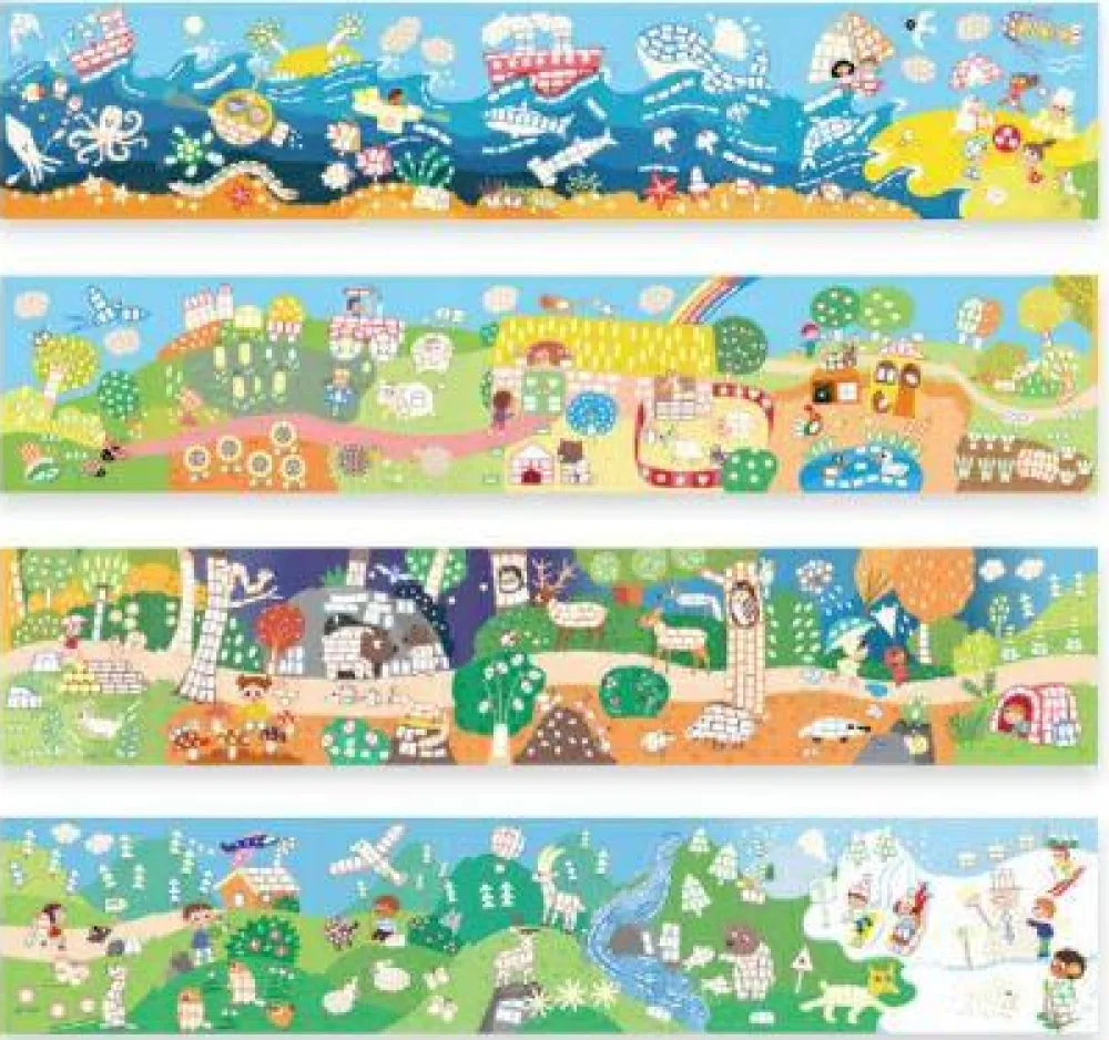Gør værelset, stuen eller klasseværelset virkelig flot med disse 4 flotte friser, som bliver til 3D-kunst ved hjælp af de miljøvenlige PlayMais, som nemt klæbes på de lange mosaikker ved hjælp af vand. Hver del måler 42×30 cm og tilsammen danner de 28 dele en frise på næsten 8 meter.