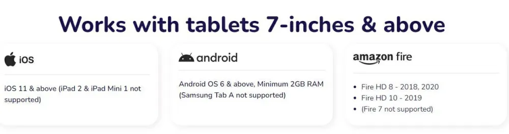 | Kompatibel med: | Works with tablets 7-inches & above // iOS 11 & above (iPad 2 & iPad Mini 1 not supported) // Android OS 6 & above, Minimum 2GB RAM (Samsung Tab A not supported) // Fire HD 8 – 2018, 2020 Fire HD 10 – 2019 (Fire 7 not supported) |