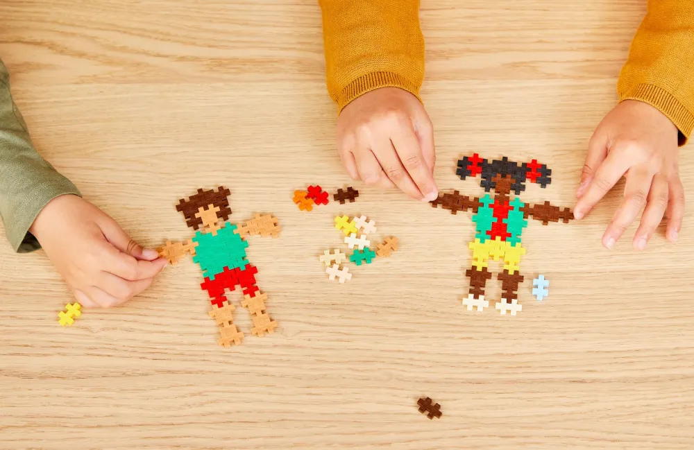 Brikkerne ligner små plusser og kan sættes sammen både i 2D og 3D – og de findes i rigtig, rigtig mange farver og både 2 x 1,2 x 0,4 cm og 5 x 3 x 1 cm. Herligt konstruktionslegetøj, som de fleste børn elsker. Leg med Plus-Plus udvikler ungernes sans for geometri og logik. Du kan se massevis af vejledninger og forslag til at bygge med Plus-Plus på fx YouTube.
