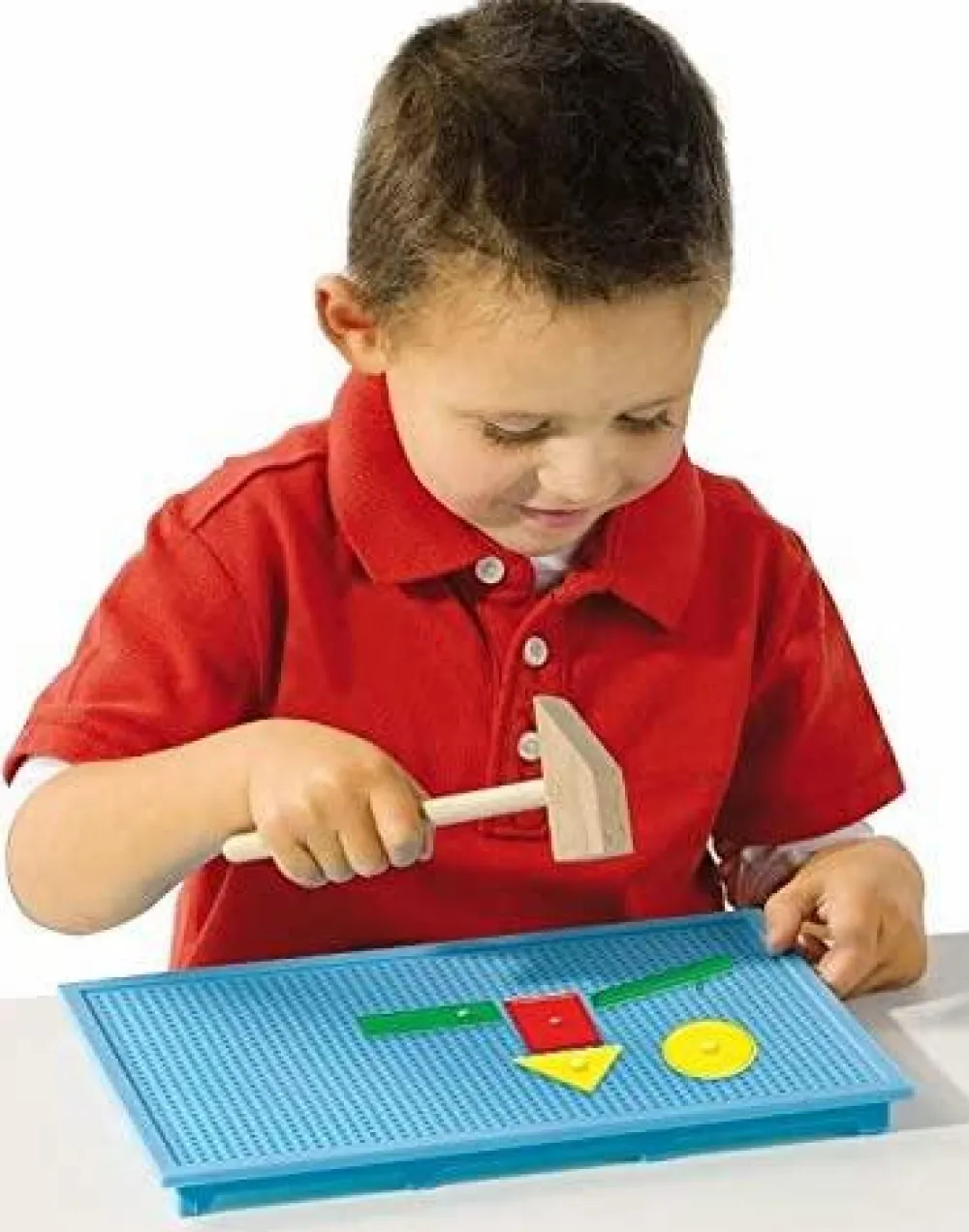 Klassikeren med hammer og søm er moderniseret. Nu bliver sømmene ikke væk, for de er integreret i figurerne. Legen er stadig lige sjov, og dit barn har mange timers leg foran sig, mens det får en tidlig introduktion til geometriske former og mønstre.