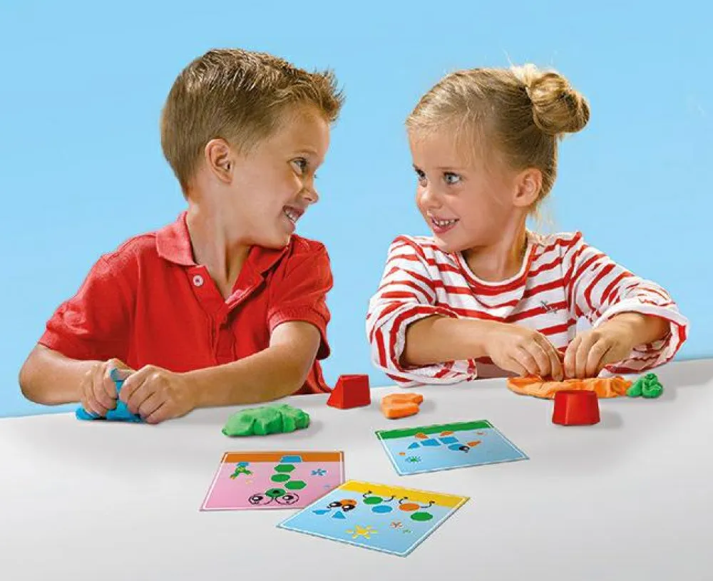 3 bøtter med modellervoks og en samling af fine udstiksforme samt 6 kort, som I kan matche formene med.