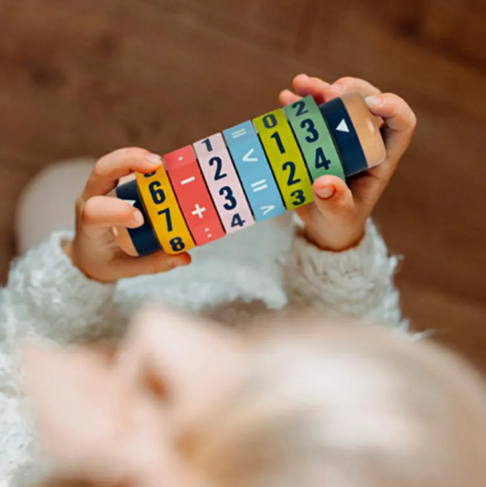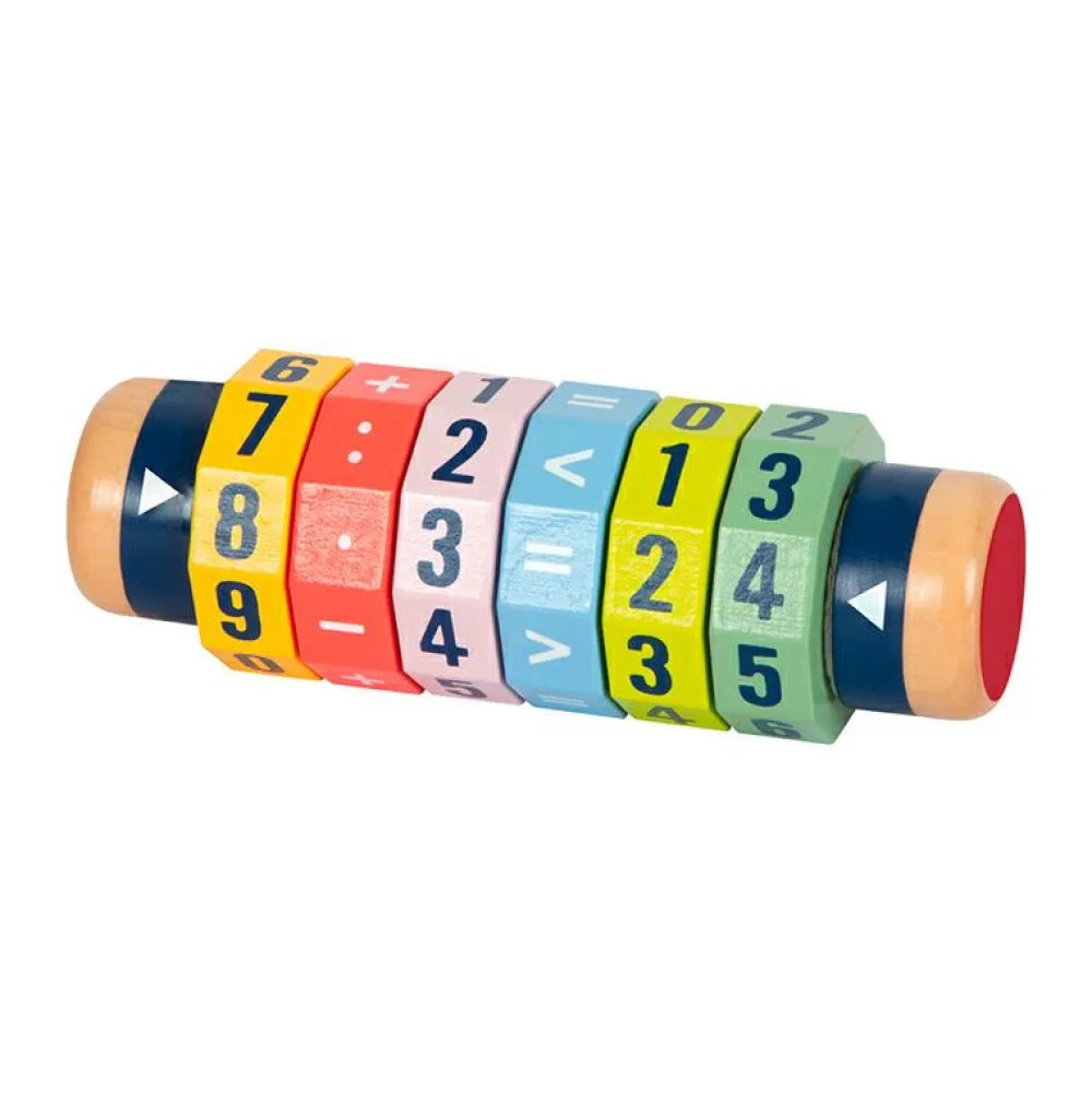 Regnerulle med 6 roterende skiver, som lader jer finde på regnestykker med svar fra 1-99. Eller brug “større end”-tegnet, hvis 99 er for lidt.