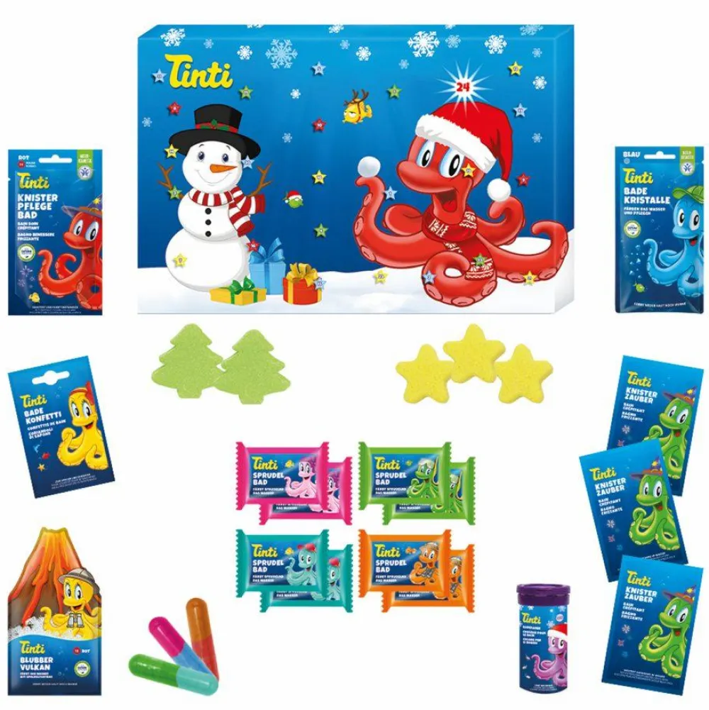 5 badebomber formet som juletræer og stjerner, 3 ampuller med badesvampe i, et rør med 10 badevandsfarver i en limited edition, 3 knitrebad, en pakke badekonfetti, 8 små badebomber, en boblende undervandsvulkan, en omgang blå badekrystaller og en pose rødt knitrebad.