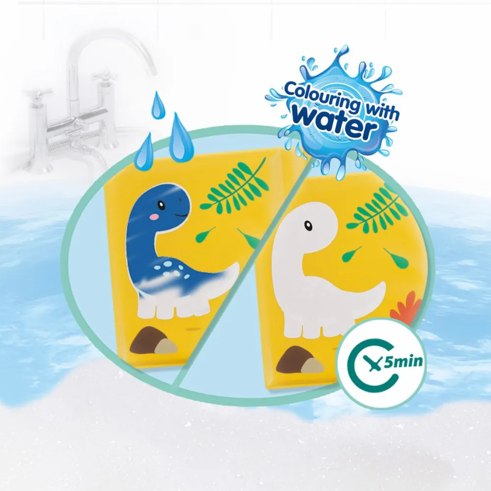 Her er 8 sider med i alt 15 dinosaurer, der får farver på, når dit barn drypper vand på dem eller rører dem med våde hænder. Det er jo nærmest magi, som kan underholde, mens dit barn sidder i blød.