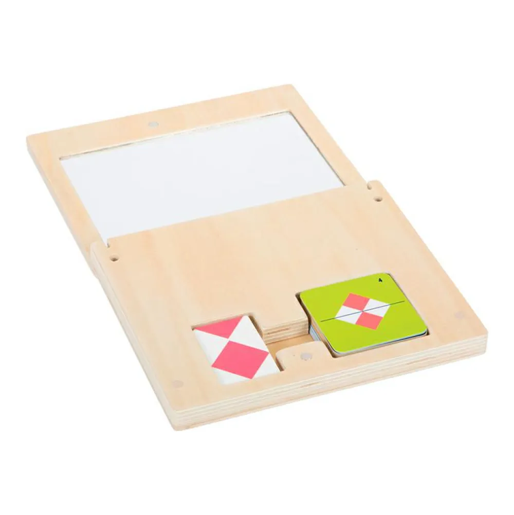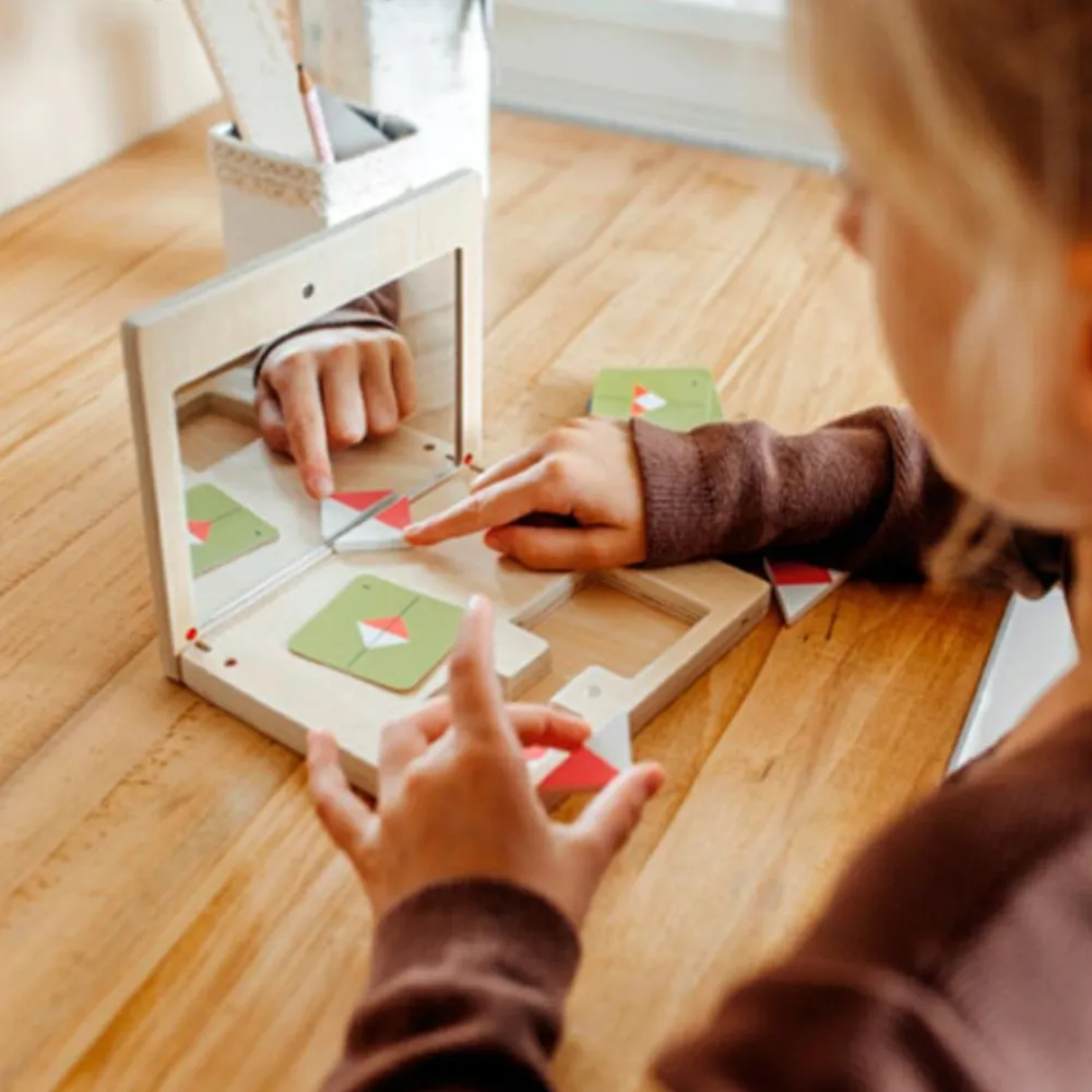 Når dit barn leger med spejlkassen, opstår der magiske mønstre og spændende former. Ved at placere træbrikkerne foran spejlet kan dit barn eksperimentere med symmetri og opdage, hvordan spejlingen skaber nye figurer. De medfølgende kort viser forskellige opgaver, hvor dit barn kan prøve at genskabe mønstre med brikkerne og spejlets hjælp. Opgaverne har forskellige sværhedsgrader.