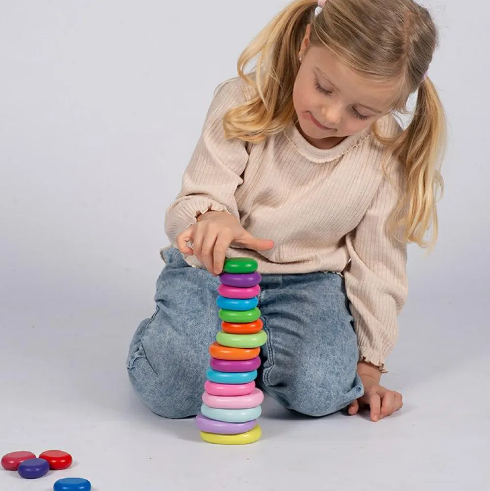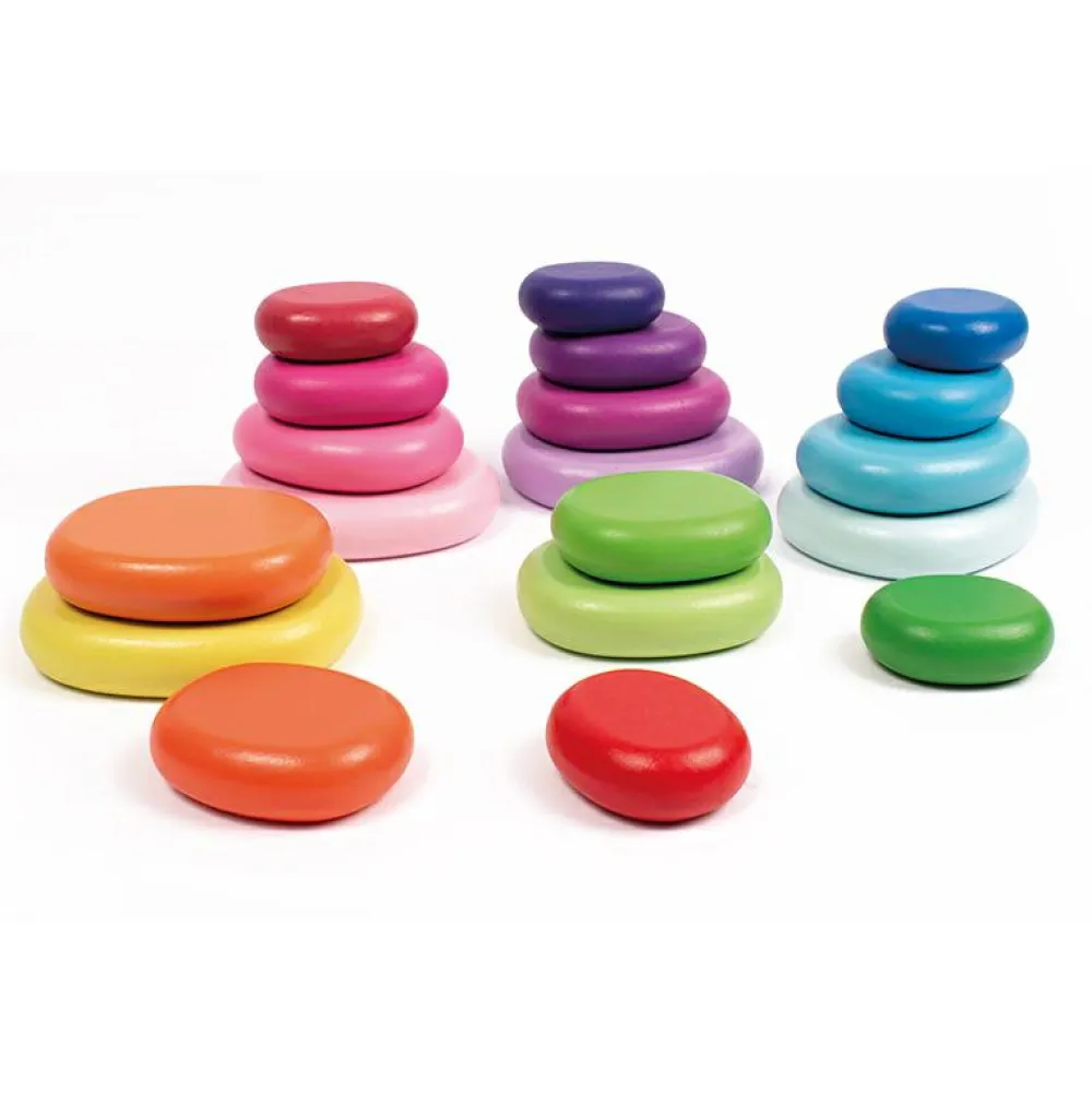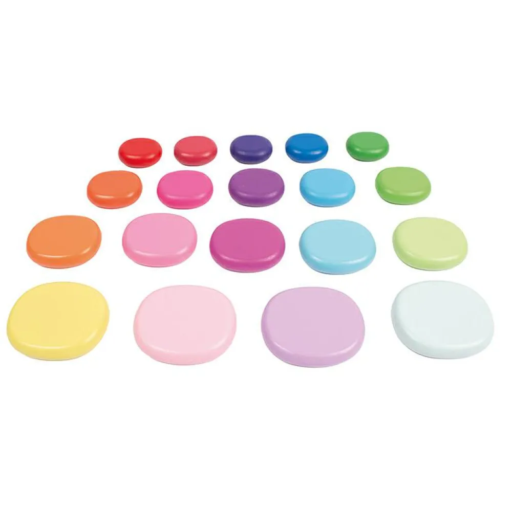 20 glatte stablesten af træ som inviterer dit barn til intuitiv leg. Der er ingen regler for, om dit barn bruger stenene til at trille med, farvesortere eller stable tårne med de mindste øverst – eller nederst for at se, hvordan det går.