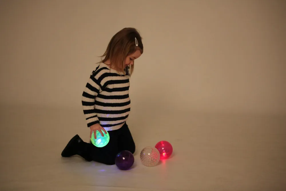I kan fx lege med boldene ved at tage bind for øjnene og så skulle gætte, hvilken farve, bolden med dutterne på overfladen har. På den måde stimurerer dit barn sin følesans og hukommelsen samt lærer farvernes navne. For var det nu den lilla eller den gule bold, der havde dutter?