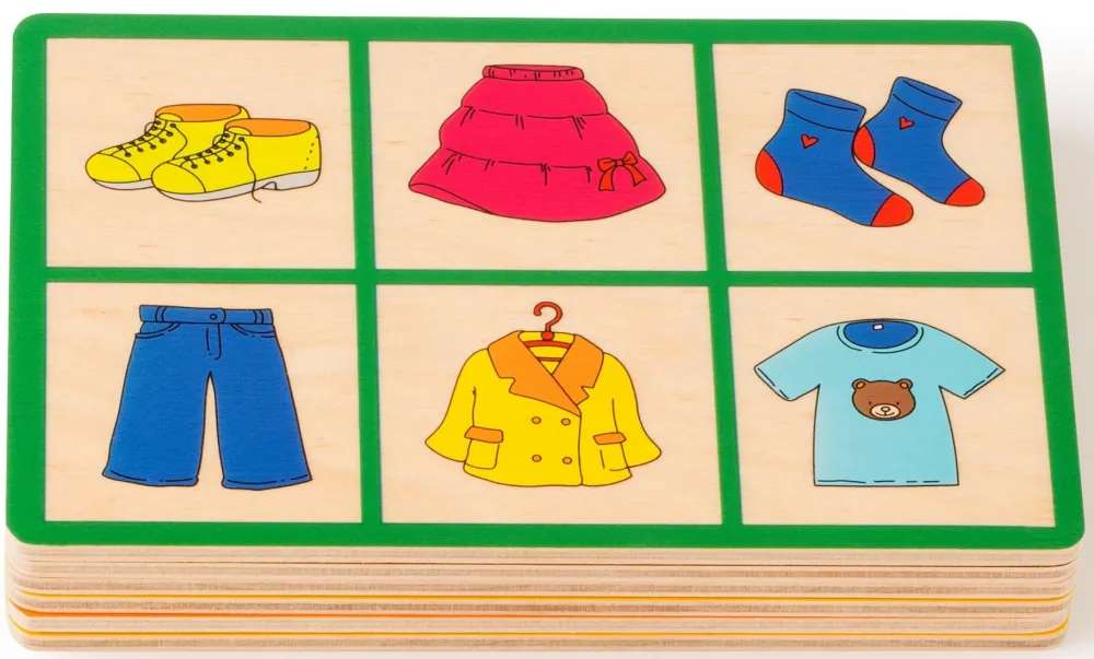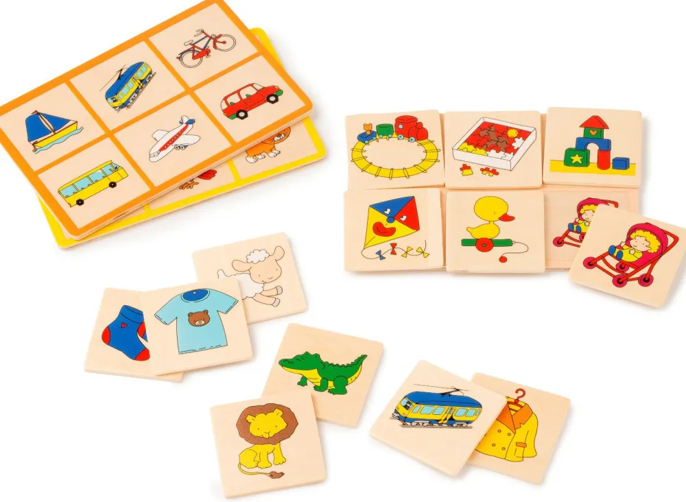 Træ billedlotteri med fine og letgenkendelige motiver som dyr, legetøj og tøj. Det handler om først at få fyldt sin plade med matchende brikker.