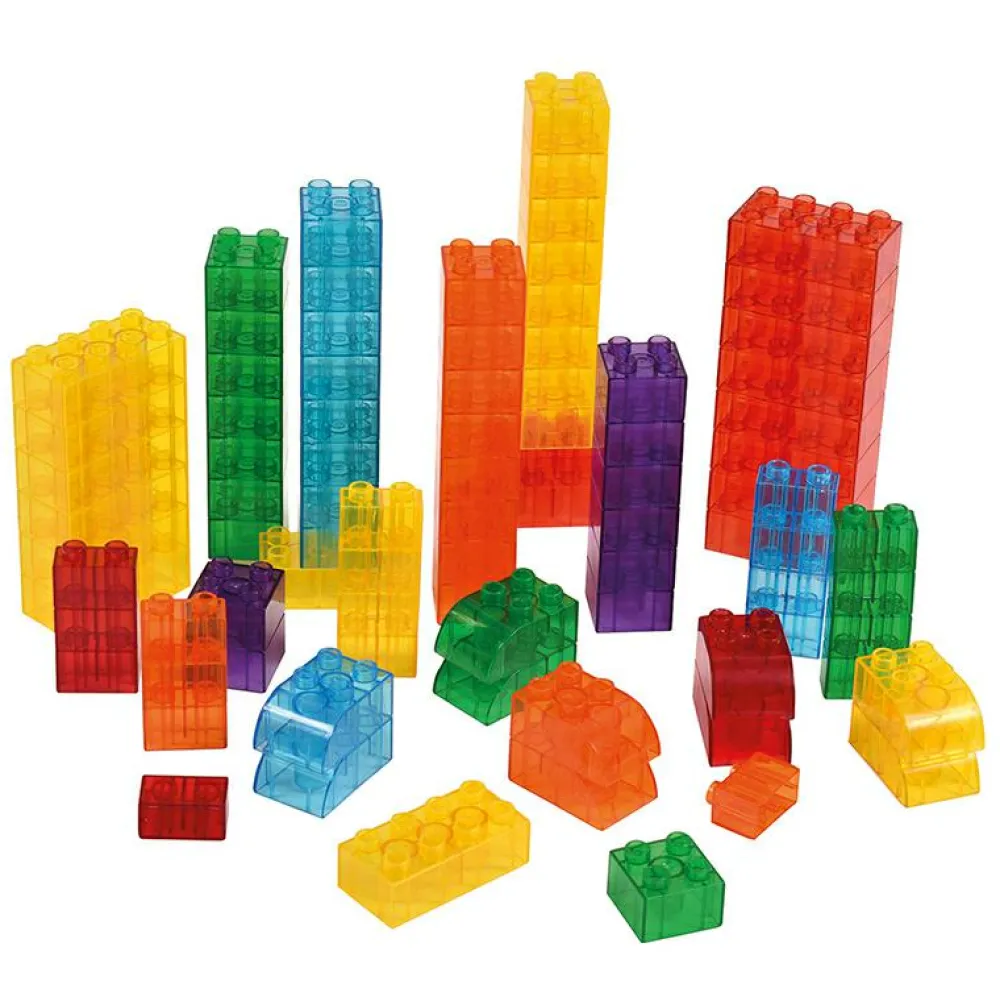 Byggeklodserne er i forskellige farver og former og oplagte at bygge med på et lysbord, hvor farverne virkelig kommer i spil – men kan også sagtens bruges uden.