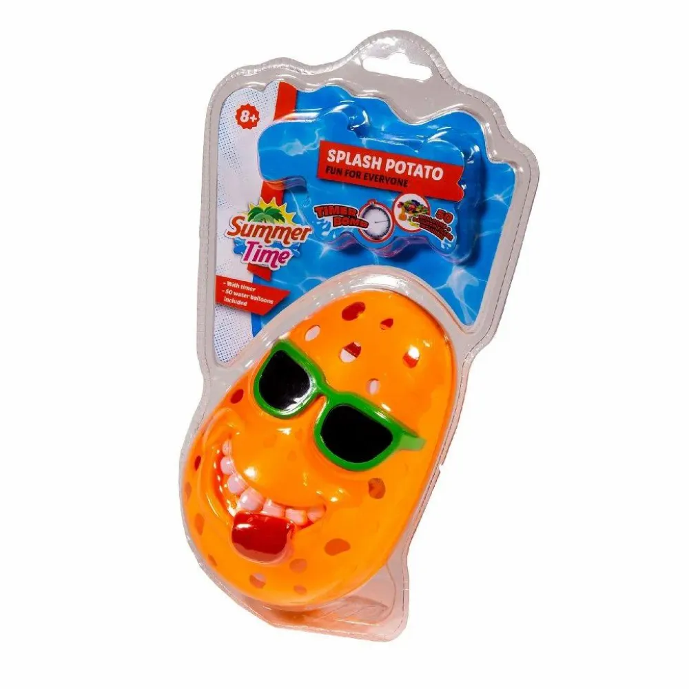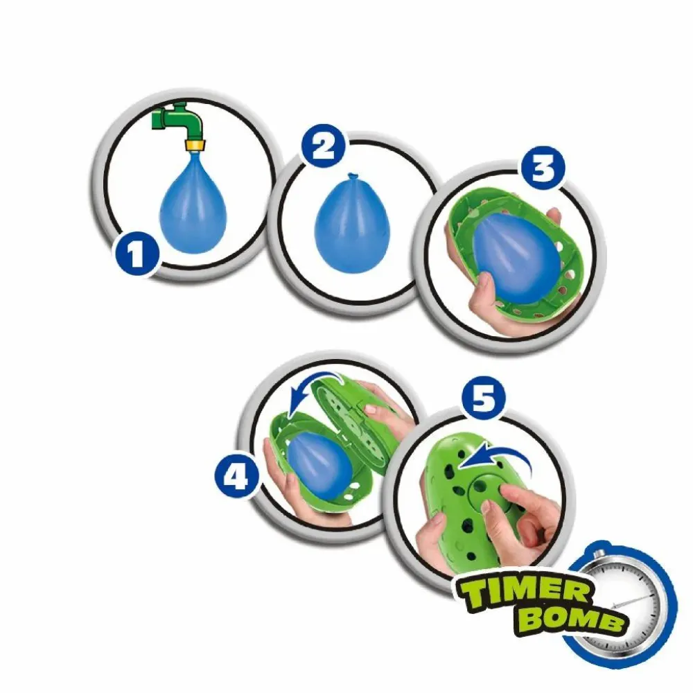 Fyld vand i vandballonen og læg den ind i den skøre kartoffel og sæt så timeren. Så er legen i gang. Den der holder kartoflen, når timeren løber ud, bliver våd.