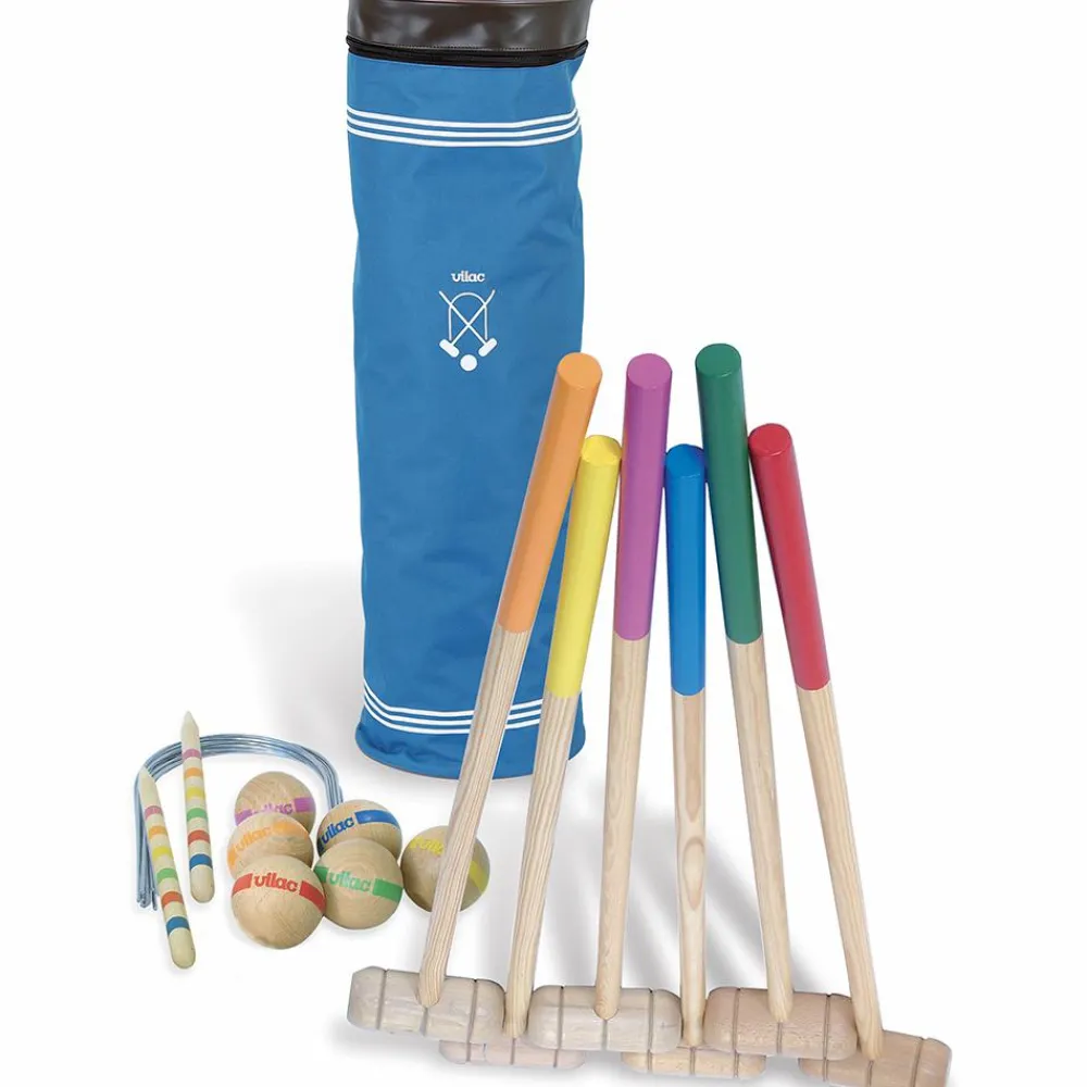 Klassisk kroketspil til haven, hvor det er muligt for 6 personer at deltage. Lav en bane på græsplænen med de 10 buer, vælg farver, og så er I klar til et spil.